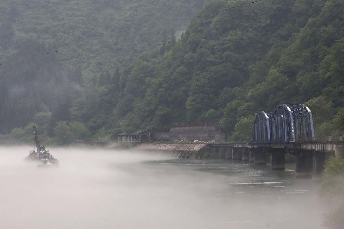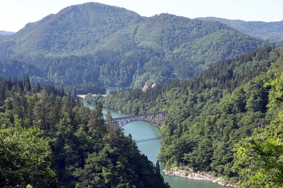 第一只見川橋梁はこの写真の向かい側、木のない河畔の一角から、あおるようにも撮影できる。こちらは会津桧原駅から徒歩15分ほどで行くことができる。とはいえ、地図に記載のない農道、そして野道のような道に入らねばならず、迷いやすい。時間に余裕を持って行動したい。