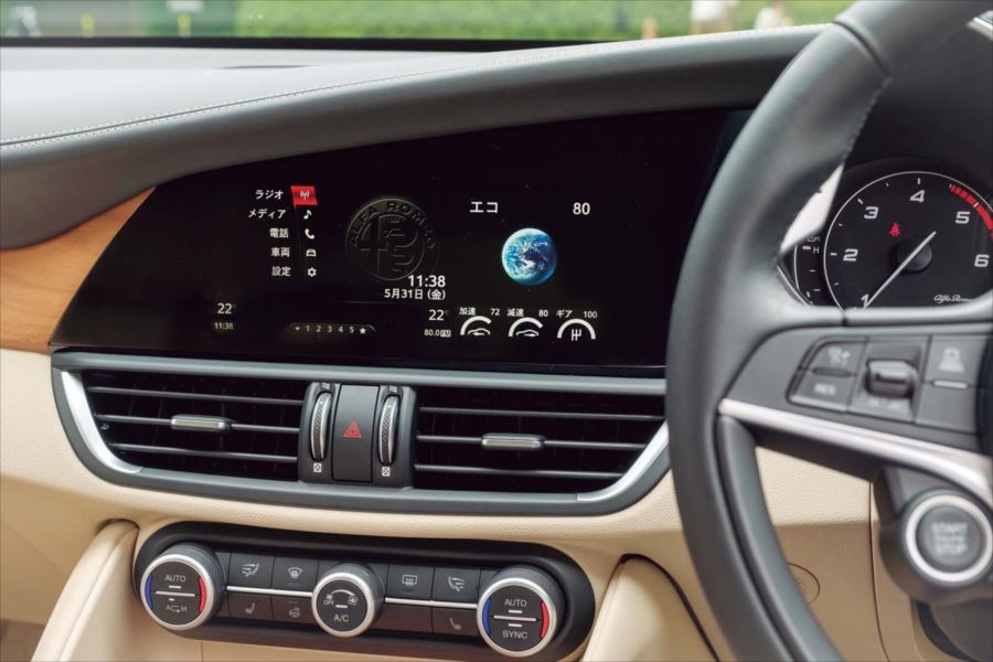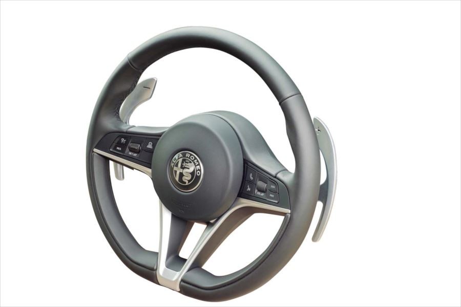 ステアリングはスリムでスポーティな形状です。正面左右に取り付けられたボタンではACCやオーディオ類の操作が可能です。シフト操作のためのパドルはかなり大きく、こういったアピールからもアルファらしさが感じられます。