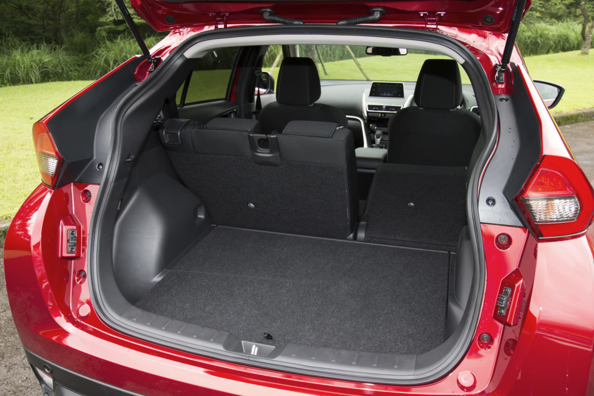 実は、スタイリング重視のクーペ風SUVながらエクリプス クロスはSUVとしての機能が損なわれていない点も魅力のひとつ。この種のモデルでは低くなったルーフのしわ寄せで後席の着座位置が不自然に低かったり、あるいは荷室が不当に狭いというケースもしばしば見られるのですが、エクリプス クロスについてはそうした不都合がありません。200㎜のスライド機構が備わる後席はサイズ相応の広さが確保され、自然な姿勢で座ることが可能。荷室容量も後席使用時で最大448L(VDA測定値)が確保され、SUVをそれらしく使いたいというニーズにも対応できます。タッチパッドコントローラーを備えたインパネ回りはクーペらしい華やかさを意識したデザインですが、クルマとしての機能はSUV基準となっているわけです。