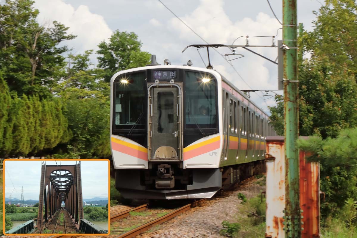 西燕駅を過ぎると、さらに田んぼが多くなり左右に広がる風景の中を弥彦線は走る。このあたりは直接ちょう架式の区間で、トロリー線が1本の架線が続く。
