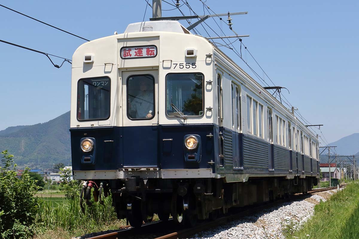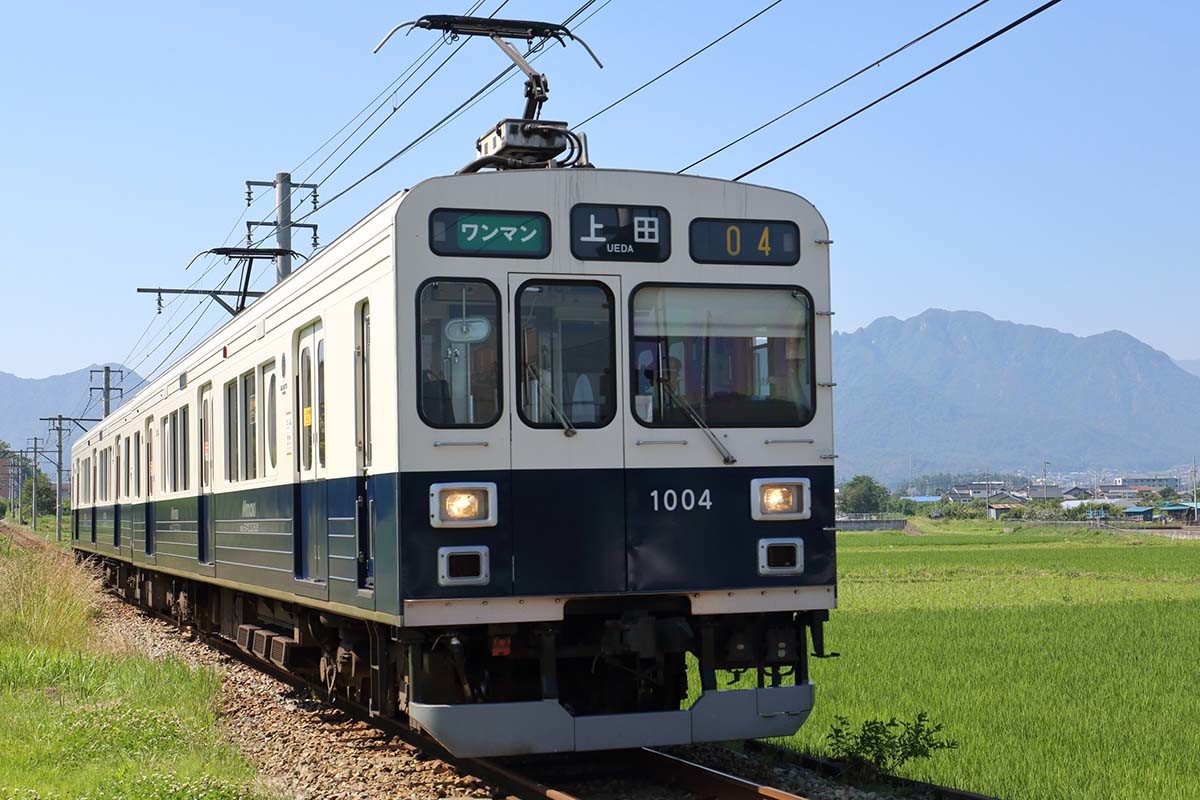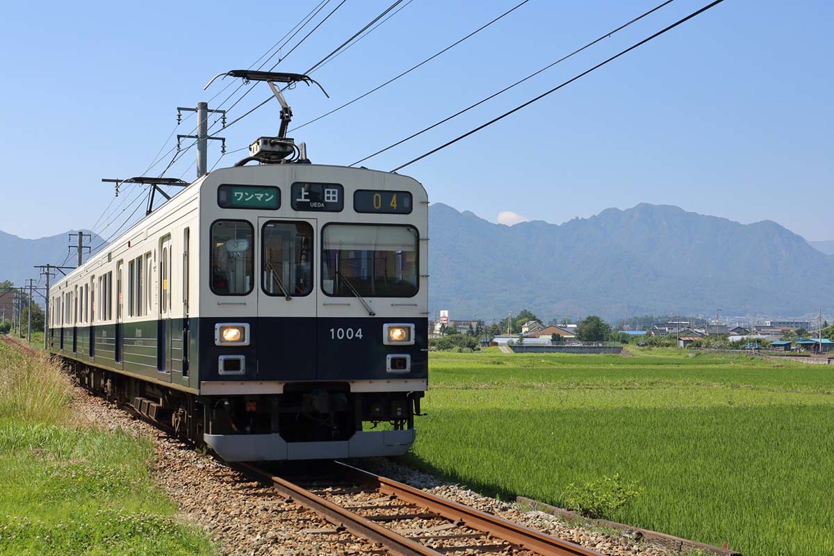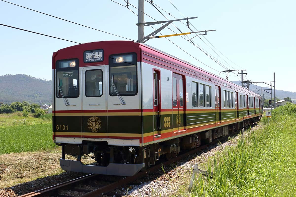 ひと駅前の八木沢駅から乗車。終点の別所温泉駅を目指す。ここから電車は坂を上り始める。平坦だった塩田平が終わり、傾斜地を登りはじめた。