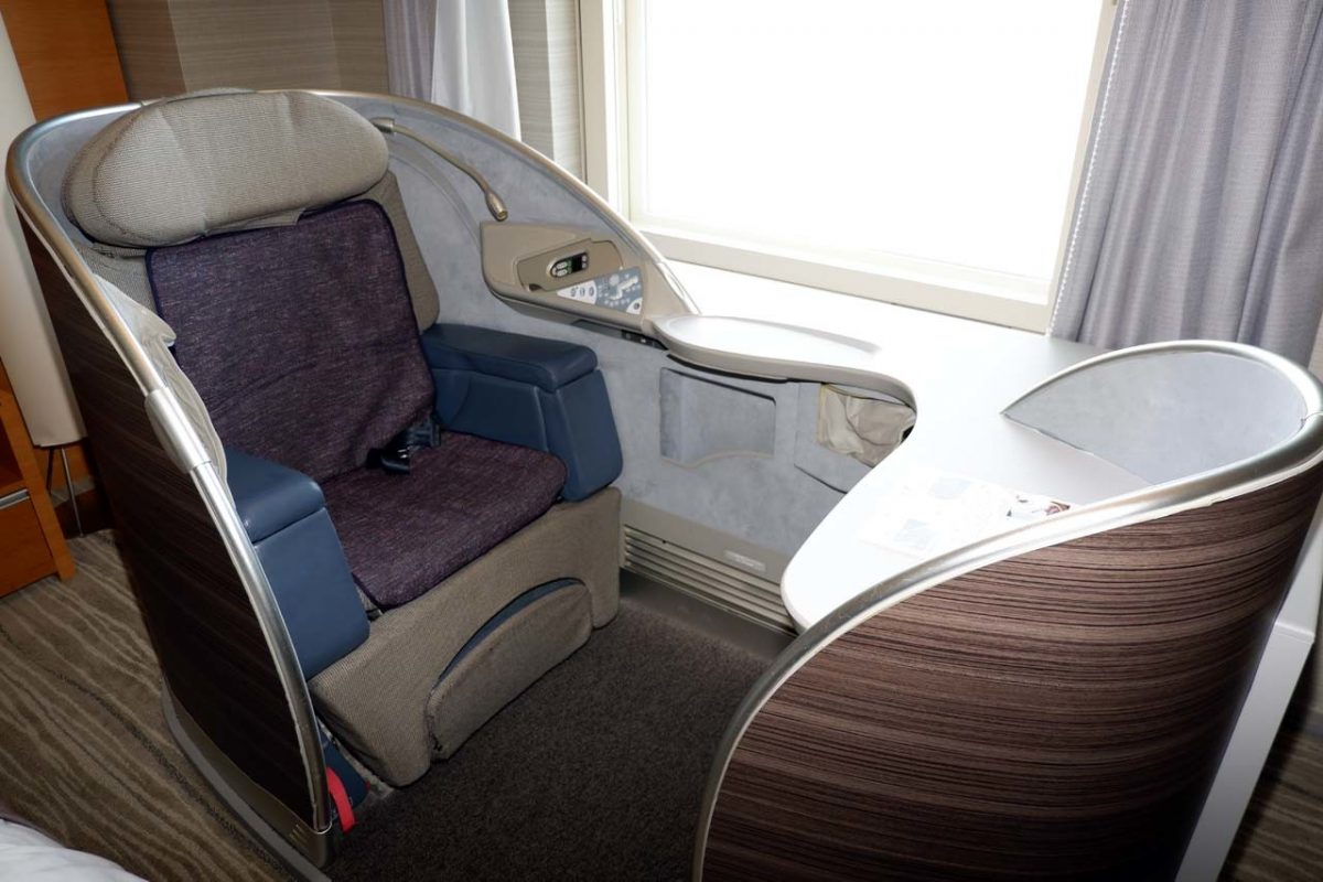 また、「プレミアフライヤーズ」という部屋には、実際に使われていたファーストクラスの座席を設置。実際にシートをフルフラットにすることができ、そこに座りながら飛行機を眺めれば飛行機ファンならずとも格別のひと時が味わえます。
