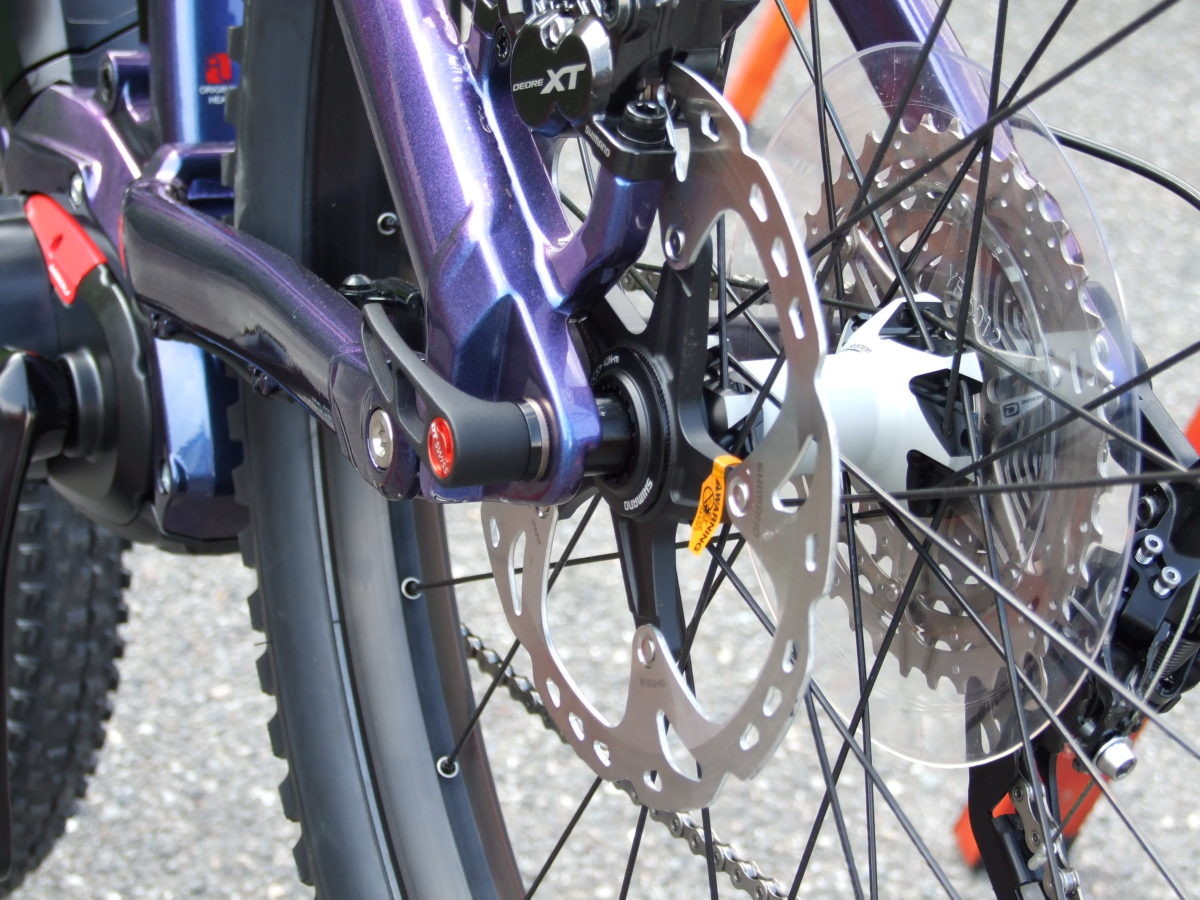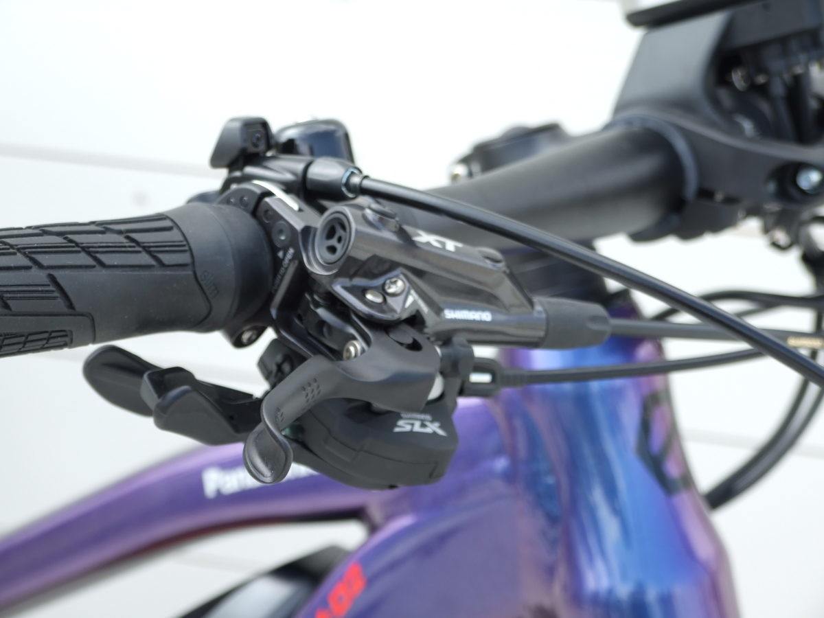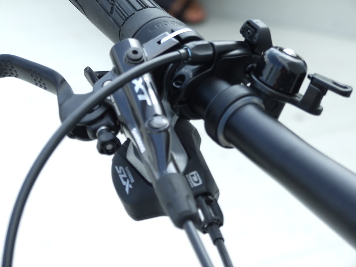 前後ブレーキは直径180㎜のディスクローターを備え、キャリパーはシマノ社製の油圧式4ピストン(DEORE XT)を採用。リムブレーキとは異なり泥濘や雨天時でも高い制動力を発揮してくれる。