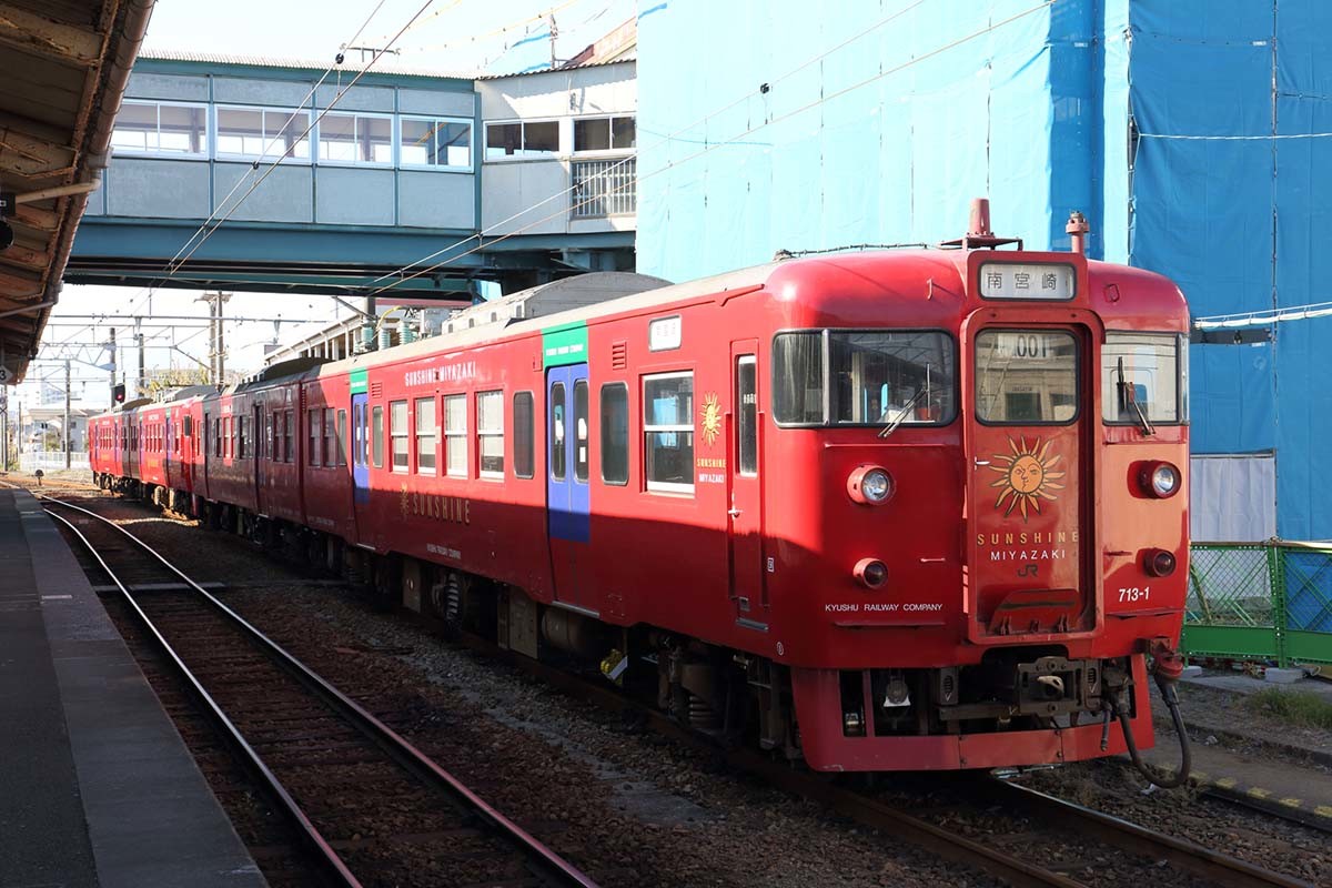 8両のみという希少車両の713系。宮崎空港開業に合わせ、赤色の塗装となり、座席は特急形車両の485系のものに変更。愛称も「サンシャイン」とされた。全車が今も残り日豊本線の宮崎地区を走り続けている。