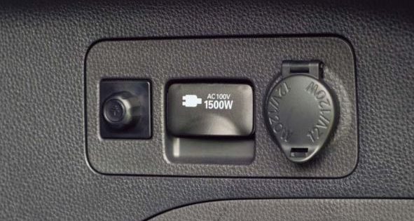 荷室には、ハッチを開けた右側に写真のような電源が付いています。シガーソケットに加え、家庭用と同じAC100Vのコンセントもあり、キャンプなどの際に家電などの電気製品を使用することができて便利です。