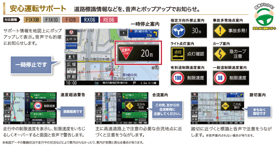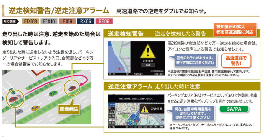 また、カーナビの機能面では「安全/安心サポート」に関する、高速道路や有料道路での逆走検知・警告を強化しています。これはあおり運転と同様に、昨今問題になっている高速・有料道路の逆送問題を減らすため。SA(サービスエリア)やPA(パーキングエリア)から出発する際は音声と画面表示で注意喚起。逆走を検知した場合は直ちに音声と画面表示で警告してくれます。特にこの逆走機能では、新たに都市高速でも対応したほか、逆走の起こりやすいSA/PA入口付近でも対応して逆走検知箇所を増加させて安心度を高めました。
