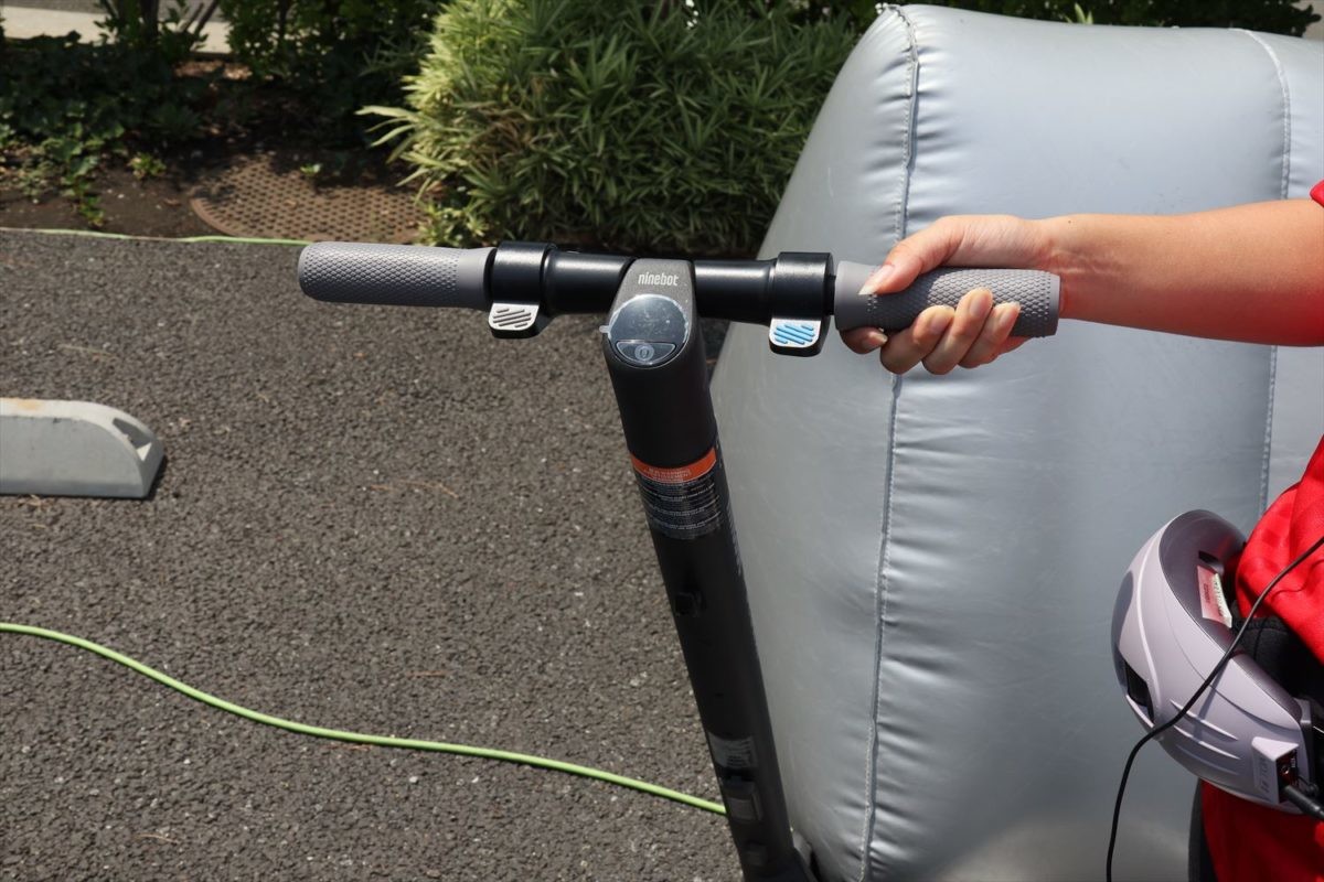 ハンドルの右についている青いレバーがアクセル、左のレバーがブレーキ。ハンドルを持ってアクセルレバーを下げればスピードが上がり、曲がる時はハンドルを曲げるだけ。アクセルのレバーを戻すだけでもスピードはかなり落ちますが、一般的なキックスケーター同様に後輪カバーを足で踏んでもブレーキが効きます。約3.5時間の充電で約25kmの走行が可能。最高速度は25km/h、本体重量は約25.5kgです。希望小売価格は10万円(税別)。