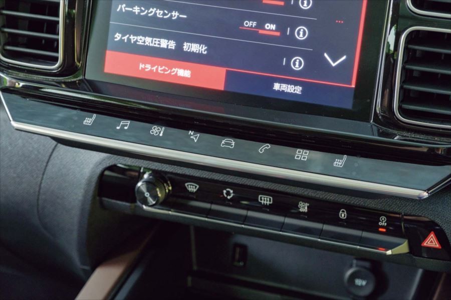 カーナビやエアコンなどのスイッチ類は、インパネ正面にモダンな雰囲気に水平基調で並べられ、高級感のあるピアノブラックでまとめられています。上段は直接タッチして、下段はクロームのスイッチ部分を押して操作します。