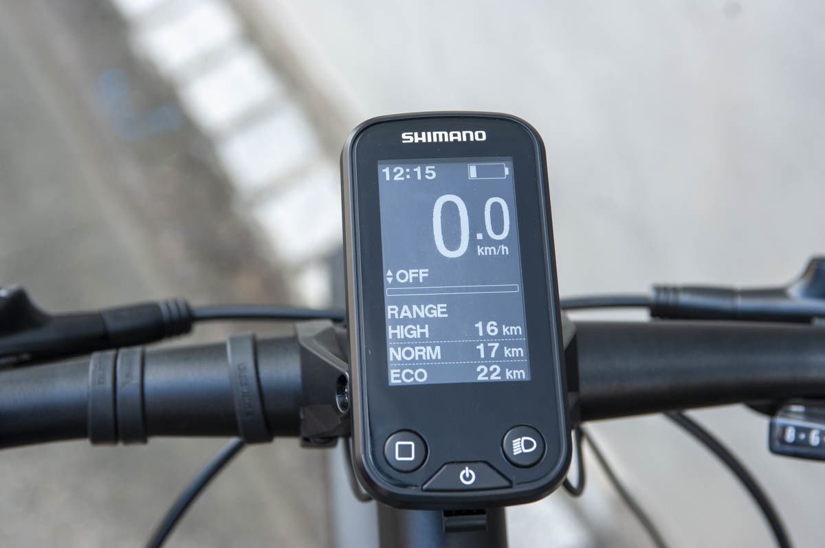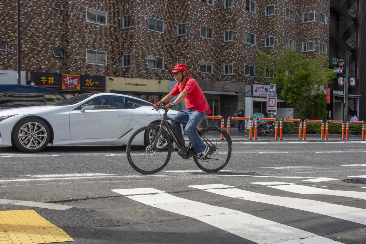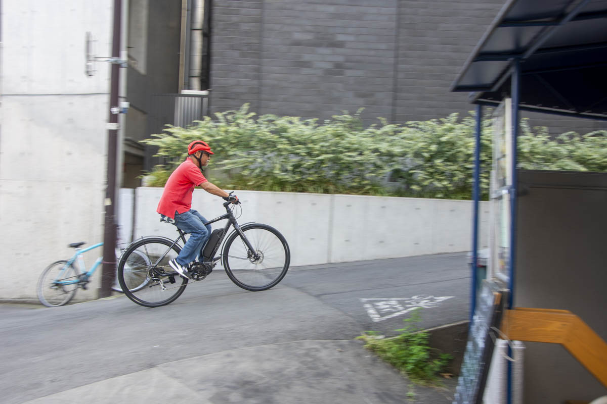 実際に試乗してみるとアシスト力は驚くほどパワフルかつスムーズ。踏み出しからグイグイと力強いアシストが始まり、上り坂での発進でもふら付くこともりませんでした。ハンドルの左手にあるスイッチでハイ、ノーマル、エコの3モードに切り替えることができるので、シチュエーションに合わせてセレクトすることが可能。日本仕様の設定は最高速が24km/hでアシストが切れるものの、モーターによる加速からの巡行は快適そのもの。上り坂でも軽々と30km/hを越えて漕ぎ続けることができました。