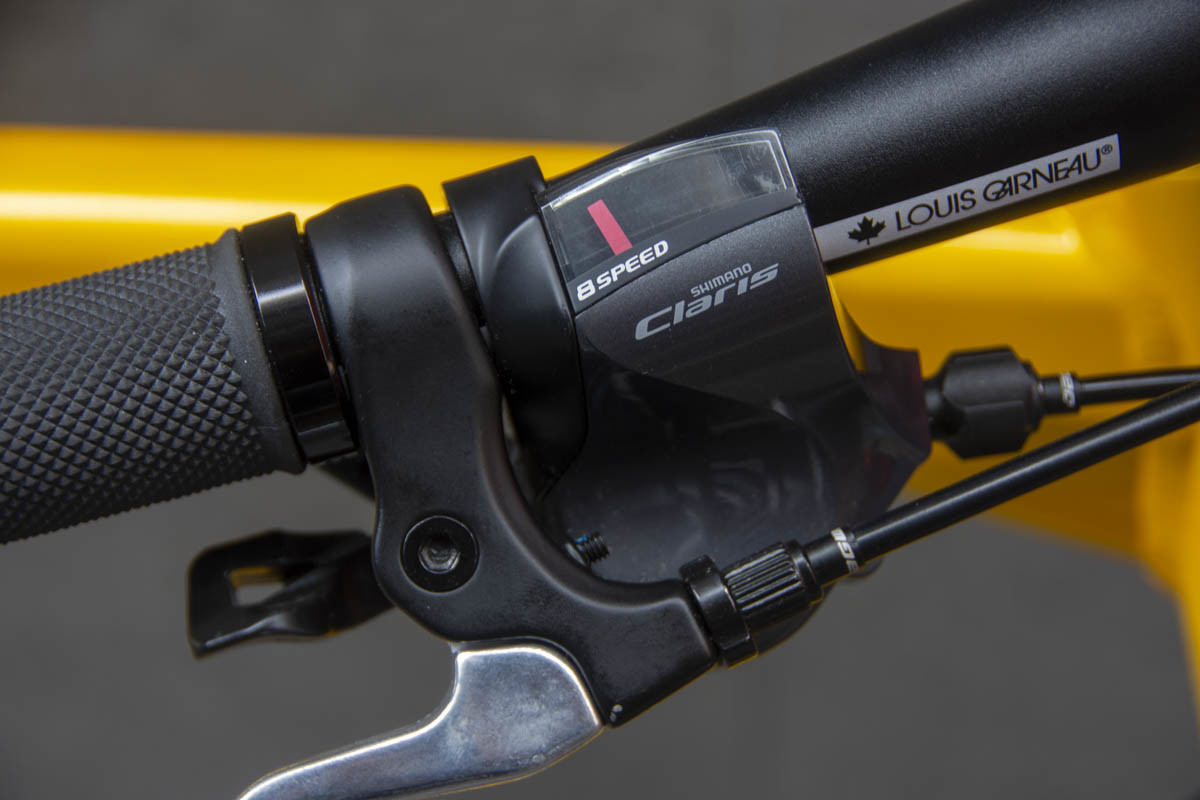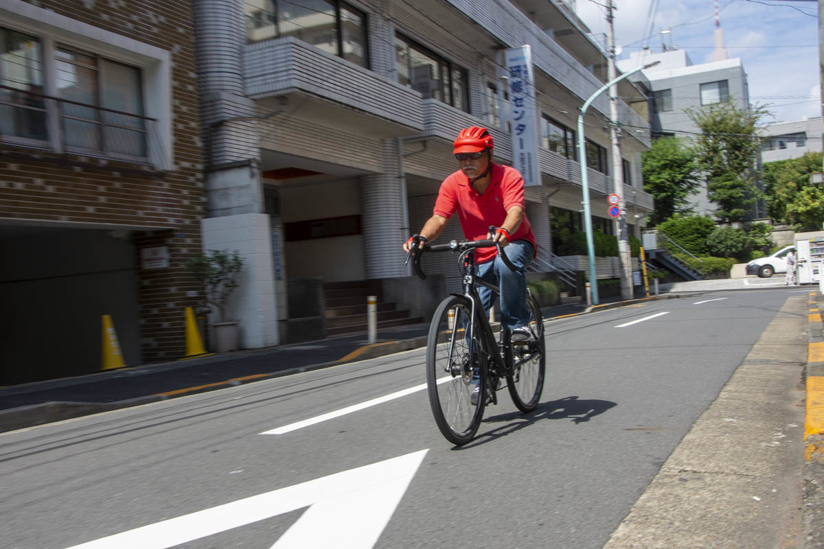 ライド感覚は12.5kg(510mm)の車重を思わせないほどのスムーズさが光りました。コンポにはシマノ社製のSORAを搭載し、シフトチェンジもカッチリとした手応えを実現。前後ともにディスクブレーキを使っているので制動力も高く安全なライドを楽しむことができました。このディスクブレーキは既存のリムブレーキとは異なり、雨や汚れに強いのが特徴で、ストップ&ゴーの多い雨の通勤や通学にも最適。ワイヤーはフレームに通すインナータイプではないものの、ダウンチューブ下に設けられ、トップチューブを肩にかけて移動するシクロクロスやグラベルロードとしての機能性も持ち合わせています。