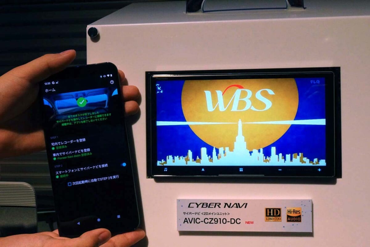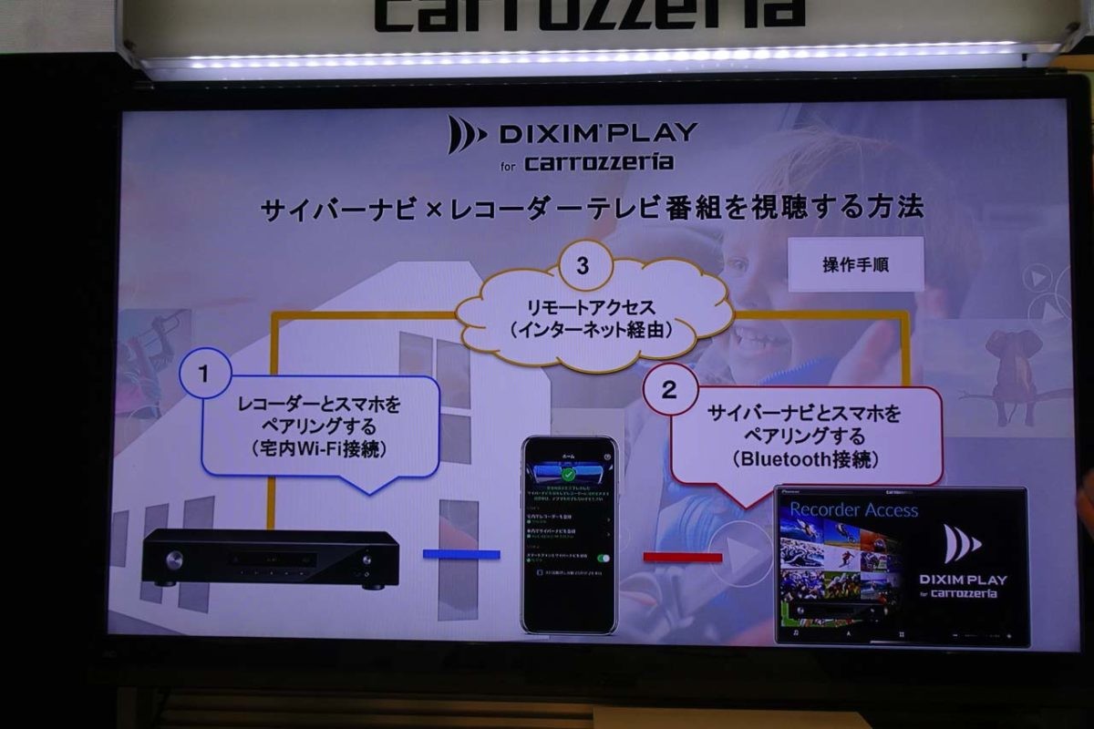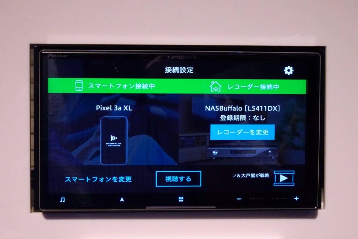 さらにストリーミングサービスとして、自宅にあるレコーダーのリモート機能にも対応を果たしました。デジオンと共同開発した「DiXiM Play for carrozzeria」を利用することで実現できるもので、ネットワークを経由することでレコーダー内の録画済みコンテンツや、受信中のリアルタイムの放送を出掛けた先でいつでも楽しめるようになります。これまでのように、レコーダーに録り貯めた番組をディスクにコピーする手間はもはや不要となりました。しかも、この機能を使えばエリアを跨いで遠くまで出掛けた時でも、地デジ放送を自宅で視聴するのと同じように楽しめます。これはレコーダーで受信できているBS/CS放送も対象となるわけで、このメリットはかなり大きいと言っていいでしょう。