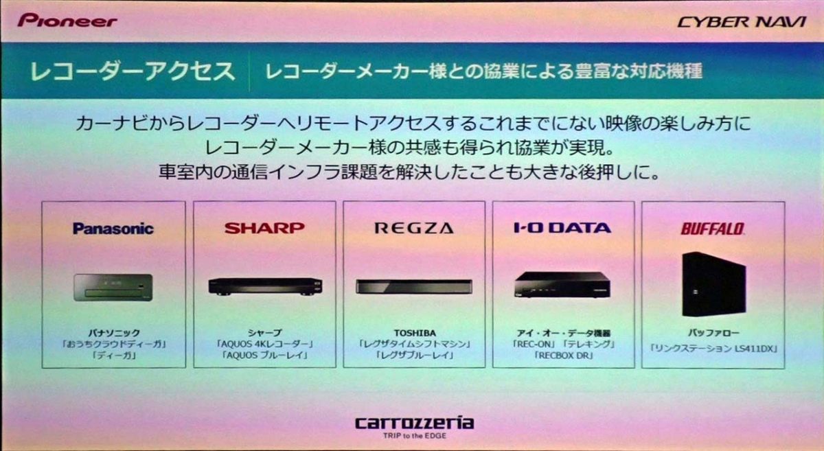 さらにストリーミングサービスとして、自宅にあるレコーダーのリモート機能にも対応を果たしました。デジオンと共同開発した「DiXiM Play for carrozzeria」を利用することで実現できるもので、ネットワークを経由することでレコーダー内の録画済みコンテンツや、受信中のリアルタイムの放送を出掛けた先でいつでも楽しめるようになります。これまでのように、レコーダーに録り貯めた番組をディスクにコピーする手間はもはや不要となりました。しかも、この機能を使えばエリアを跨いで遠くまで出掛けた時でも、地デジ放送を自宅で視聴するのと同じように楽しめます。これはレコーダーで受信できているBS/CS放送も対象となるわけで、このメリットはかなり大きいと言っていいでしょう。