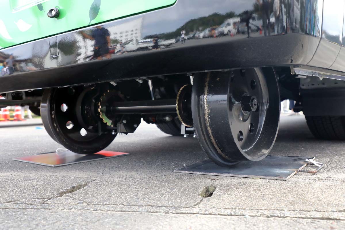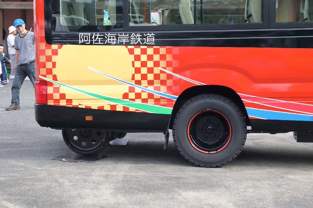 長所にまずあげられるのが、車両代が大幅に圧縮できること。ベースとなるトヨタ自動車のコースターは車両価格が700万円ちょっと。DMV用に大きく改良を施しているものの、鉄道車両コストに比べれば、整備を含めて大幅なコスト削減につながる。鉄道車両が定員100名に対して、23名と小さくなる短所はあるが、このコスト削減の効果は魅力大だろう。