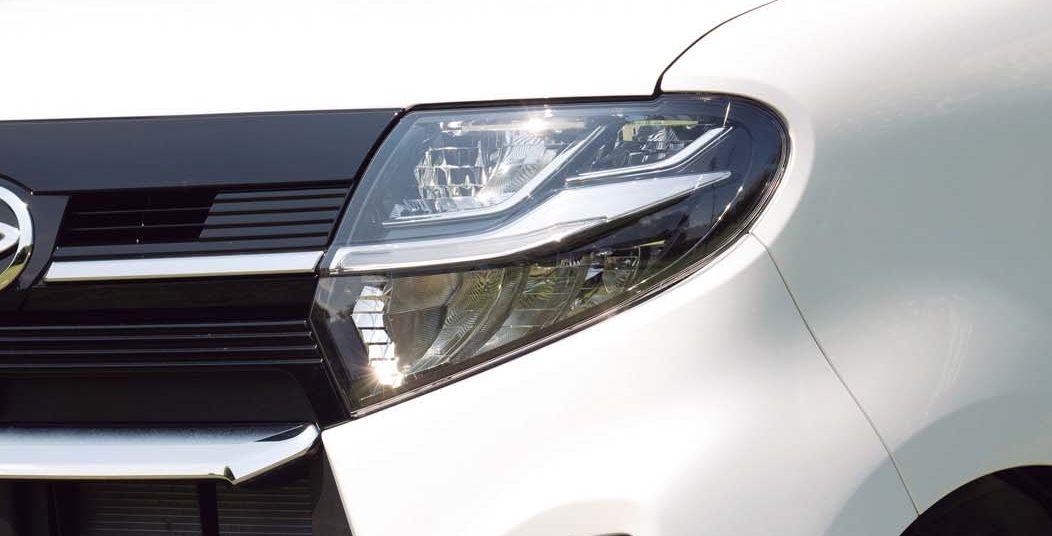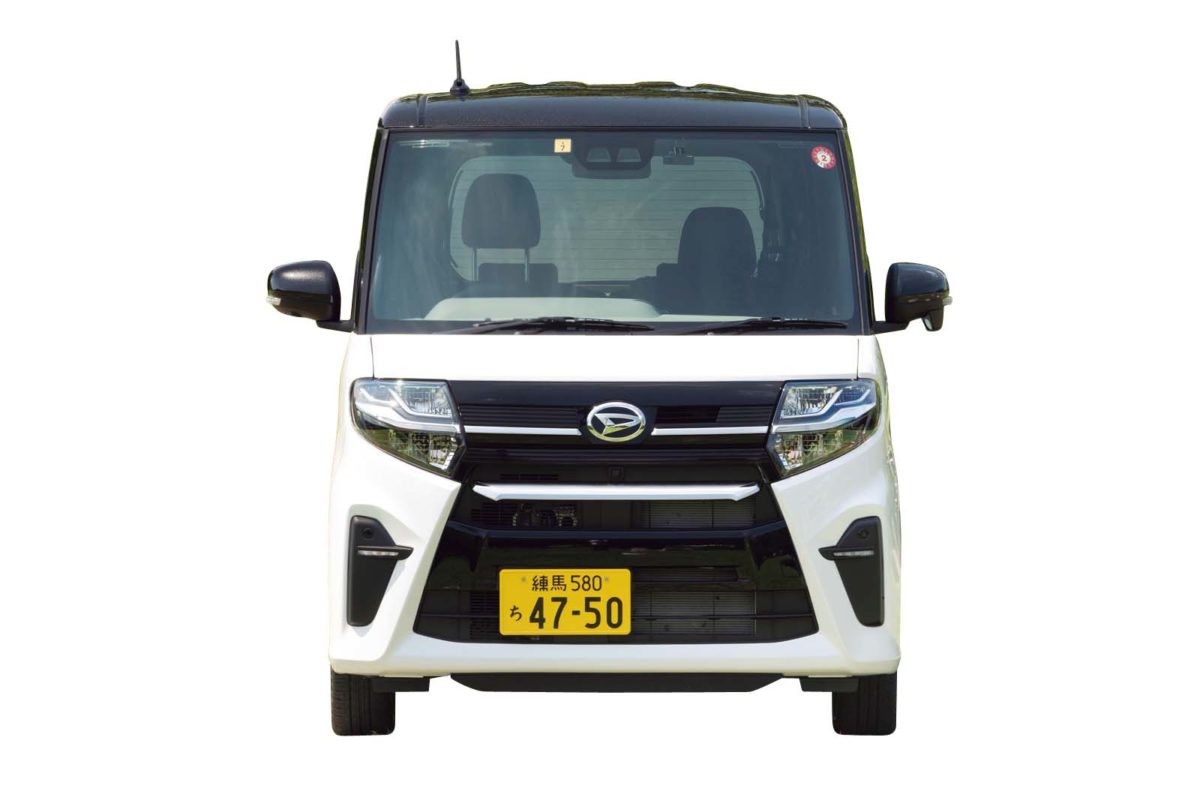 ベースの「タント」とこの「タントカスタム」では顔の印象が大きく異なります。タントは横長ヘッドライトですが、カスタムはこのようにツリ目気味で、左右下端には黒いモールが付くなど、存在感を主張しています。