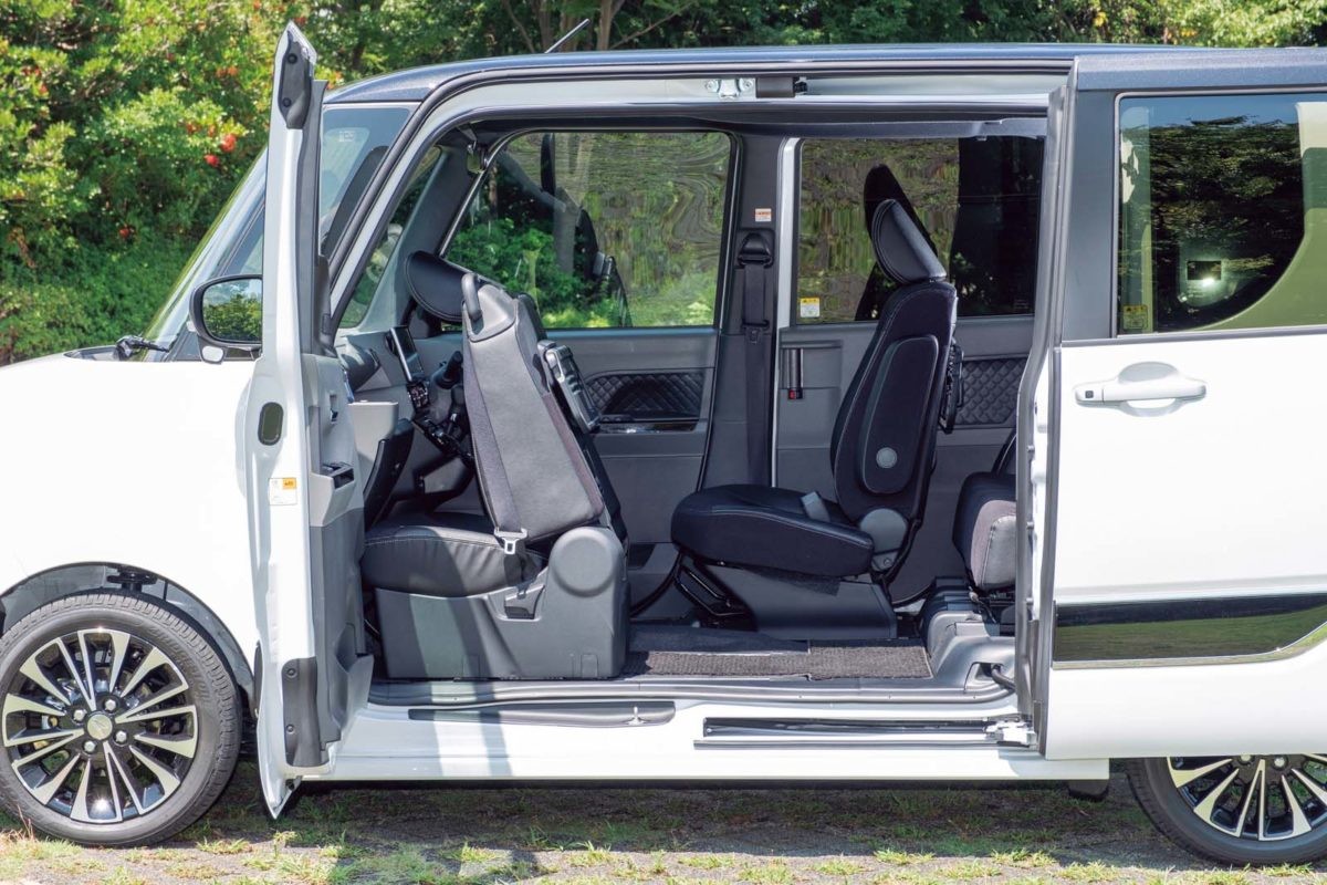従来からあるBピラー(前後席間の柱)をドアに取り込んだ巨大な開口部の「ミラクルオープンドア」に加え、運転席と助手席のロングスライドも可能です。写真のように運転席を後ろへ、助手席を前へスライドさせれば、クルマから出ずに運転席から後席へ移動できるほか、運転席に座ったまま後席シートへ手を伸ばすことも可能です。