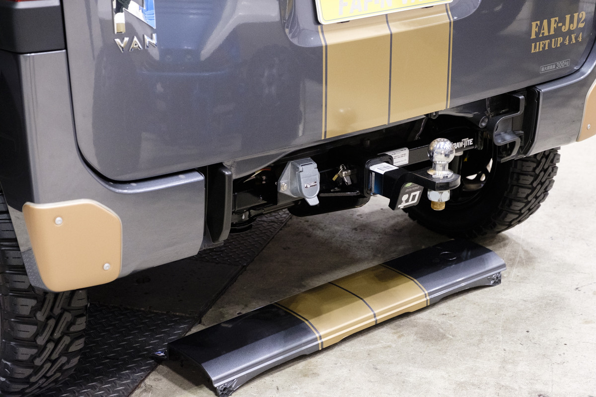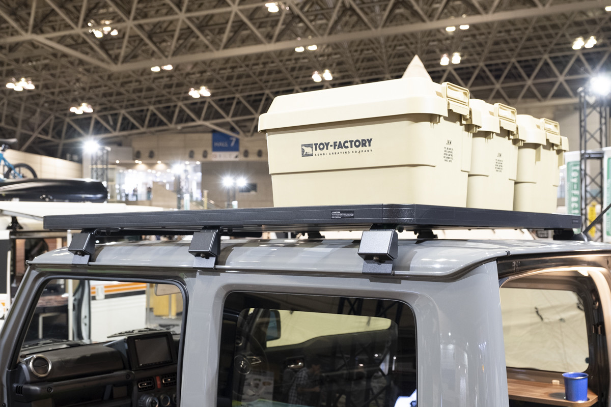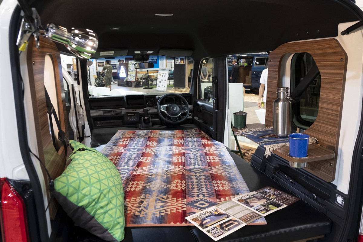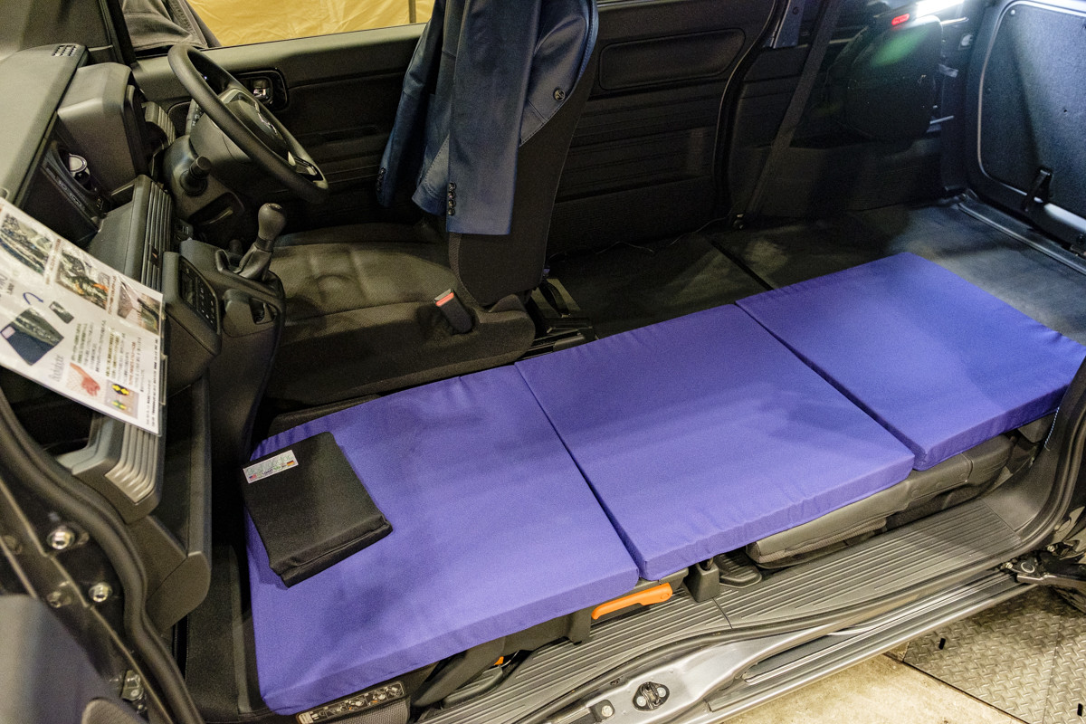 岐阜県のショップ、トイファクトリーが展示していたN-VANと新型ジムニー。それらの車両に装着されていたのが、同社のオリジナルアイテム「コンフォートフルフラットベッドキット」。車両シートを倒して、その上に載せるだけの簡単設置でフルフラットベッドになります。クッション材を丁寧に縫製仕上げで厚みは60mm。他にはサイドウッドボード&ミニテーブルセットを付けています。ジムニーには、サイドストライプデカールキットも貼っています。