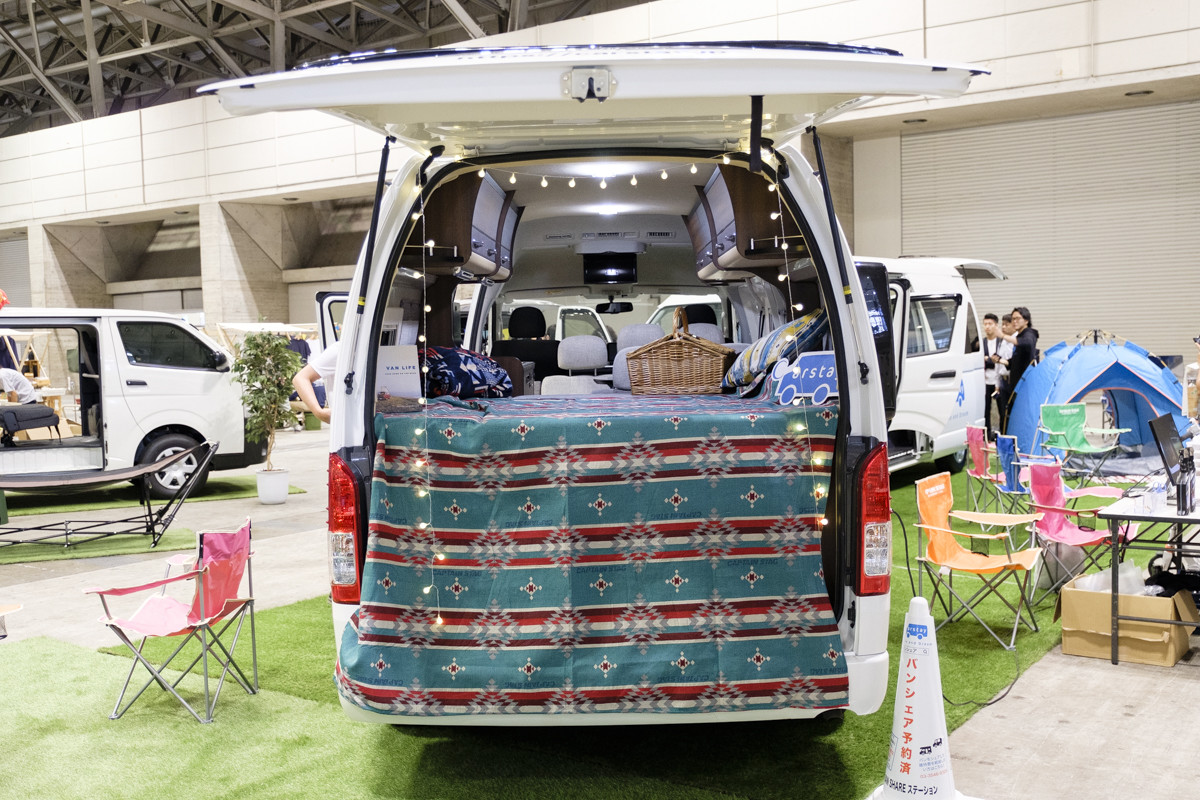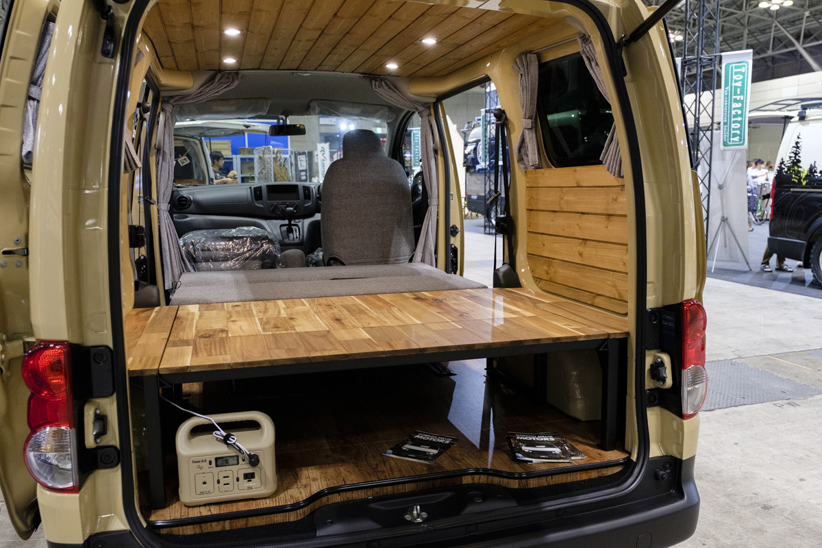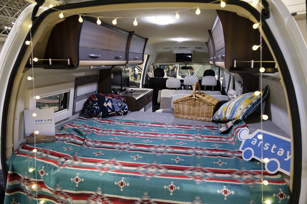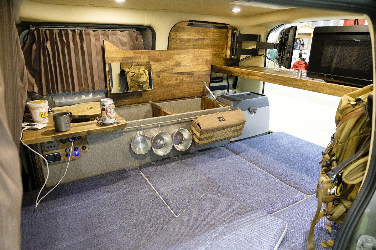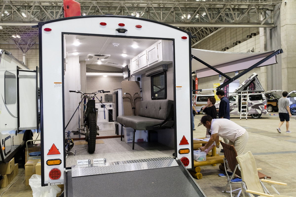 茨城県のショップ、アールブイランドが展示していたのは「FLAGSTAFF E-PRO E16TH」。同車両はバイクなどを積み込める、遊びの最前線に立つユーザーのためのベースキャンプです。キッチンやトイレ&シャワールームといった基本的なキャンピング設備に加え、電動サイドオーニング、ソーラーパネルも標準装備。そして、充実したマルチメディア機器も魅力。E16THは遊びの相棒、秘密基地、ガレージなど使い方次第で「アソビタオセル」最高のパートナーです。価格は426万8000円(税込)〜。