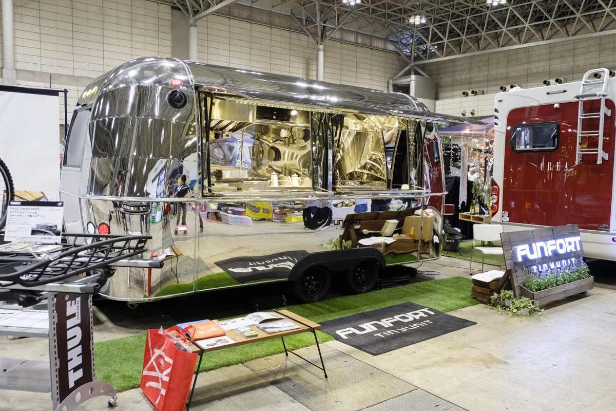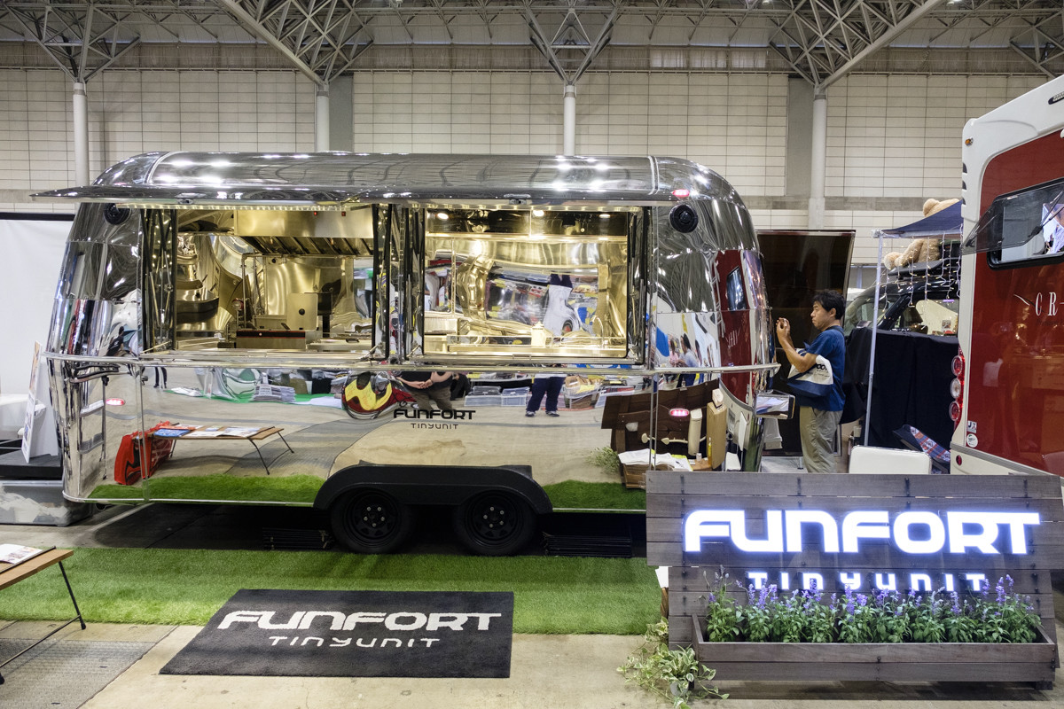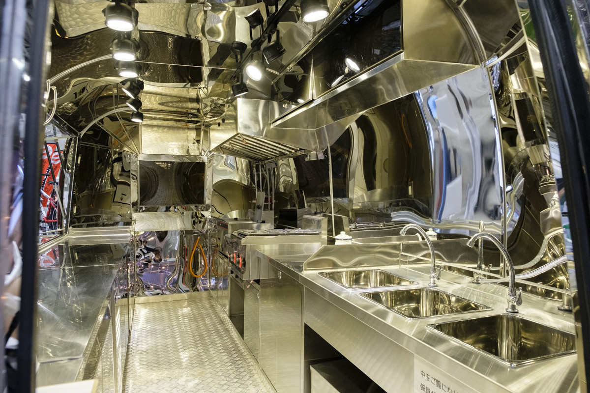 FUNFORT Tinyunitが出展していた車両は、2層式フライヤー、フラットグリドル、2口バーナー、200L冷蔵庫&220L冷凍庫、製氷機、手洗い用シンクなど、充実した装備を備える鏡面加工のキッチントレーラー。なんと言ってもピカピカの内外装が未来感抜群で、会場内で1番目立っていました。今後は、フェス会場などで見かける機会が増えるかもしれません。