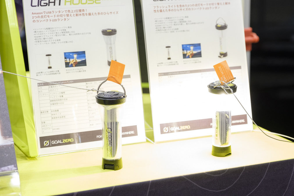「Goal Zero」は、携帯用太陽発電アイテムのブランド。今回編集部が注目したのは、モバイルLEDランタン「Goal Zero Lighthouse Micro」シリーズ。これは、最大150ルーメンのLEDライトを搭載し、2つの点灯モードの切り替えと輝度調節に対応。9.62Whリチウムイオン電池を内蔵し、最大170時間の点灯が可能です。また、ダイナモ手回し充電に対応した「Lighthouse 400」や、コンパクトに折りたためるソーラーLEDランタン「Crush Light」も展示していました。