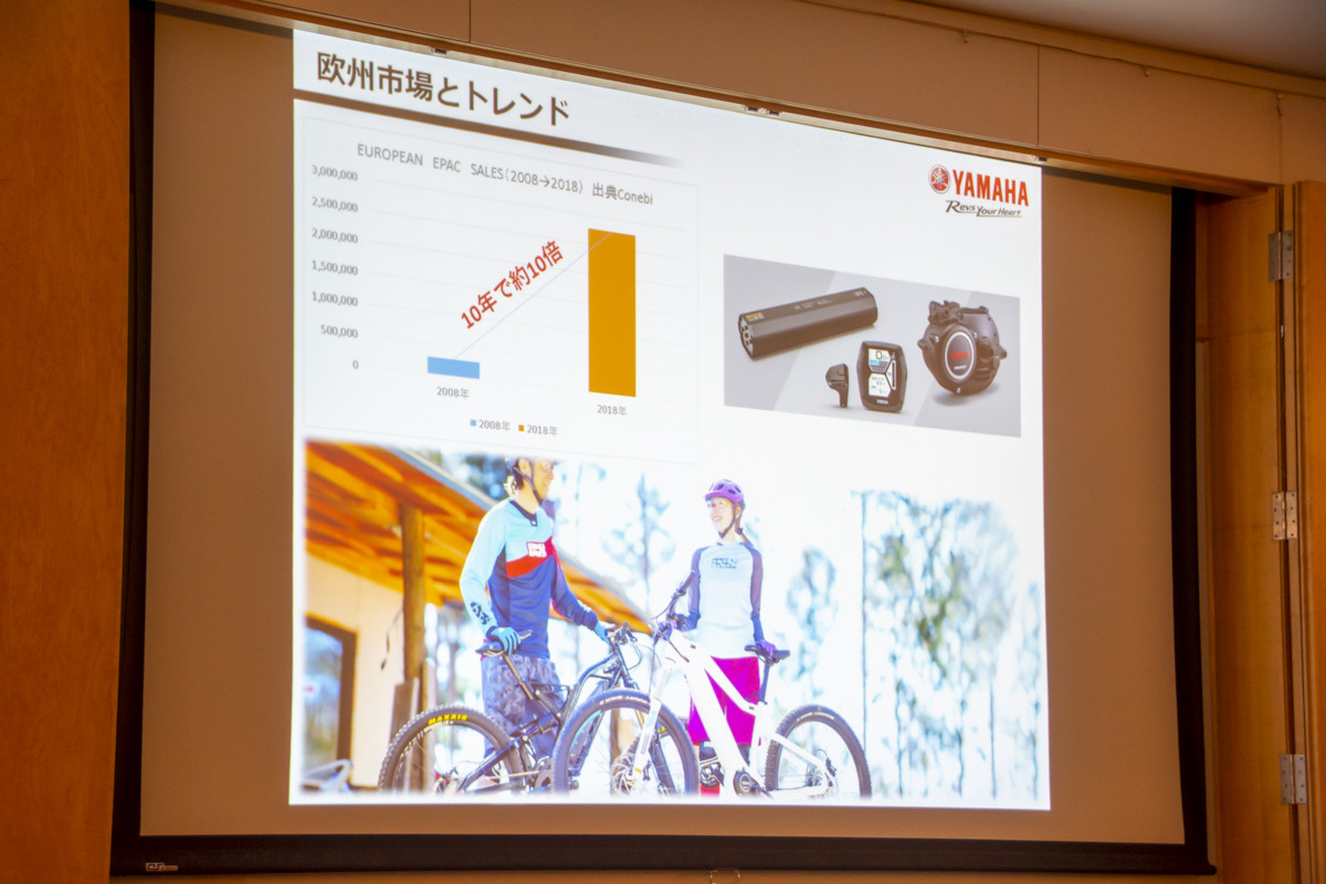 数字関連の情報も。説明会でSPV事業部長の村田さんは「2018年度は67万台の売り上げを記録し、消費税増税前の駆け込み需要はあったものの8~10%の伸び率を記録。欧州市場でも電動アシスト自転車の需要は大きな成長を遂げ、10年間で10倍もの規模へと成長し、この傾向は日本市場も同様に期待が見込めるものであり、今後もマーケットを拡大すると予想されています」とのこと。