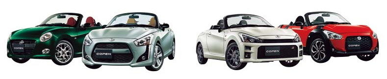 電動ハードトップを持つ軽オープンスポーツで、現行型は2代目モデル。左からコペン セロ、コペン ローブ、コペン GRスポーツ、コペン エクスプレイ(右)の4タイプが揃います。昨年には屋根の開かないクーペモデルも限定販売されました。