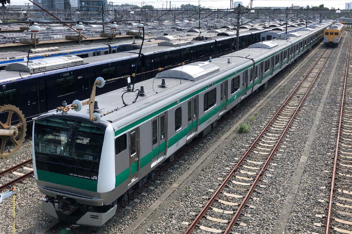 試運転電車は、右手に新鶴見信号場の留置線が並ぶ、ちょうどその横で、信号待ちのために停車した。すると…。“あれ〜!この車両はもしかして”と、乗車している鉄道好きの人たちは驚かされたのであった。