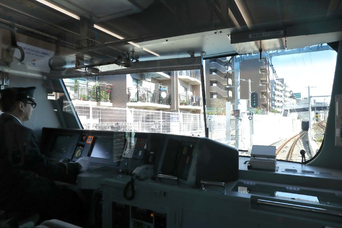 西谷駅から2分ほど。まもなく新駅の羽沢横浜国大駅へ到着した。同駅もほぼ完成していた。いまは開業に向けて工事スタッフが最終的な調整をしている様子だった。しばらくの間、停車する。この駅で、相鉄の運転士からJR東日本の運転士へ引き継がれる。