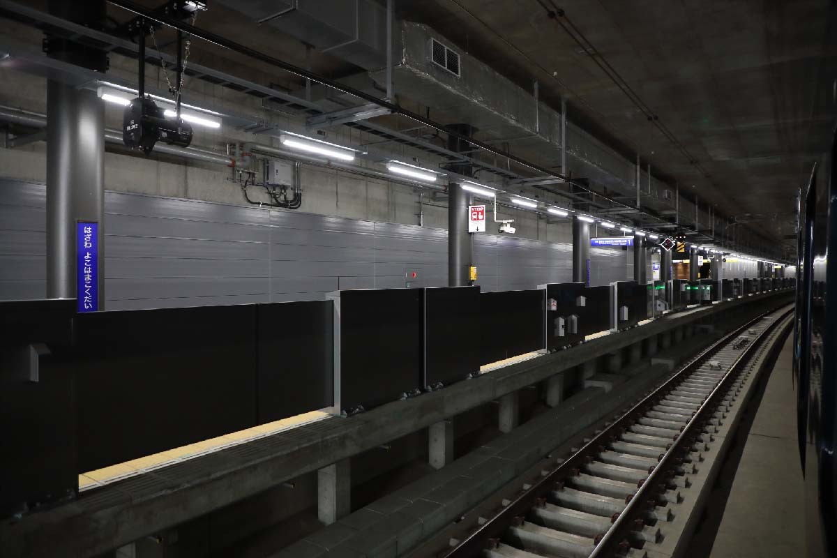 筆者が8月末に西谷駅を訪れた時には、1番線・4番線ホーム(相鉄・JR直通線用)側には、仕切りが設けられていた。そして最終工事が進められていた。およそ3か月後の試乗会の日には、仕切りもすっかり取り払われ、あとは開業を待つのみとなっていた。