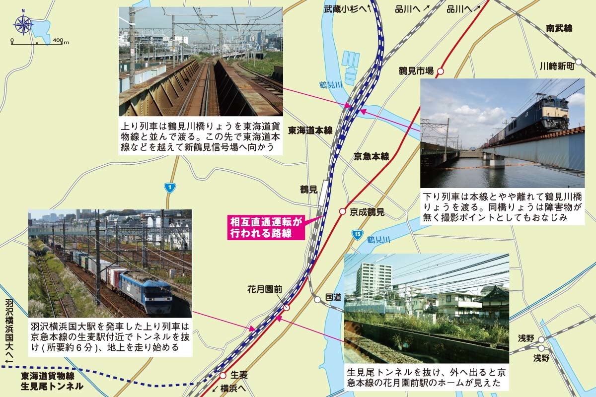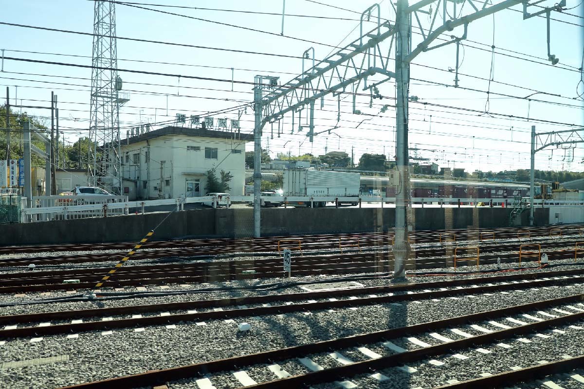 試運転電車は、右手にJR貨物の新鶴見信号場を眺めて走る。同信号場は貨物輸送にとって、拠点となる信号場で、武蔵野線を走ってきた貨物列車が、この信号場で、東海道本線方面と、東京貨物ターミナル駅方面とに分かれ、運転される。東海道本線を上ってきた貨物列車も、ここからさらに武蔵野線、山手貨物線を経由して、北は北海道・東北地方、そして甲信越地方、常磐・鹿島方面へ走っていく。