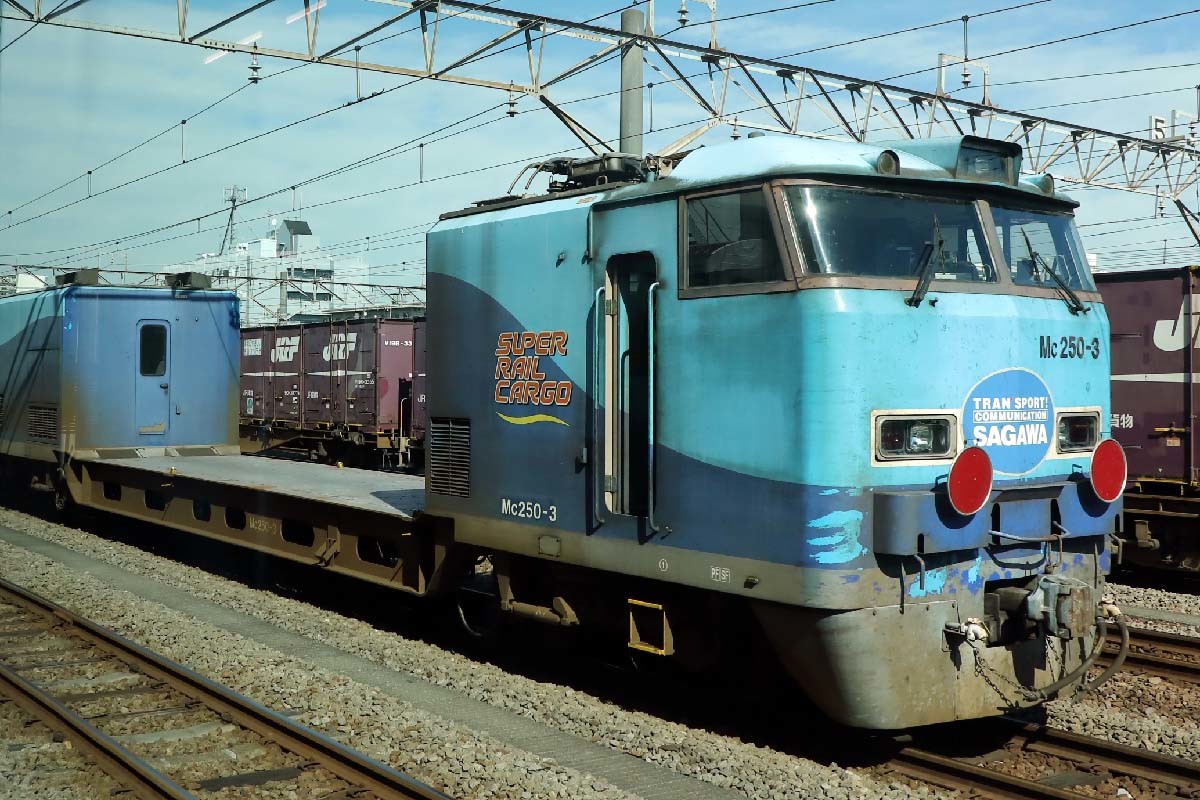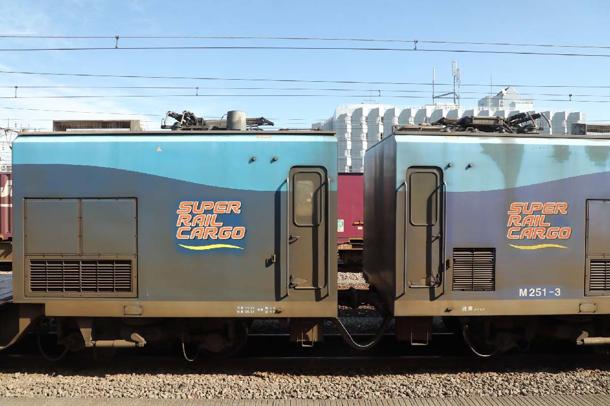 停車していたのはJR貨物のM250系電車。JR貨物で唯一の動力分散方式の“貨物電車”で、宅配事業者向け専用列車「スーパーレールカーゴ」として東京貨物ターミナル駅と大阪の安治川口駅を結ぶ。営業運転時は最高時速130kmで走る。