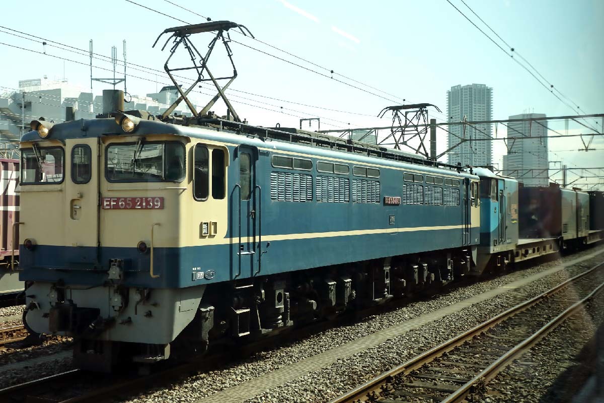 予備車両は東京貨物ターミナル駅に停まっているはずなのに、どうしてここに? 先頭にはEF65形式電気機関車が付いていたことから、検査のために大宮車両センターを目指していたことが分かった。