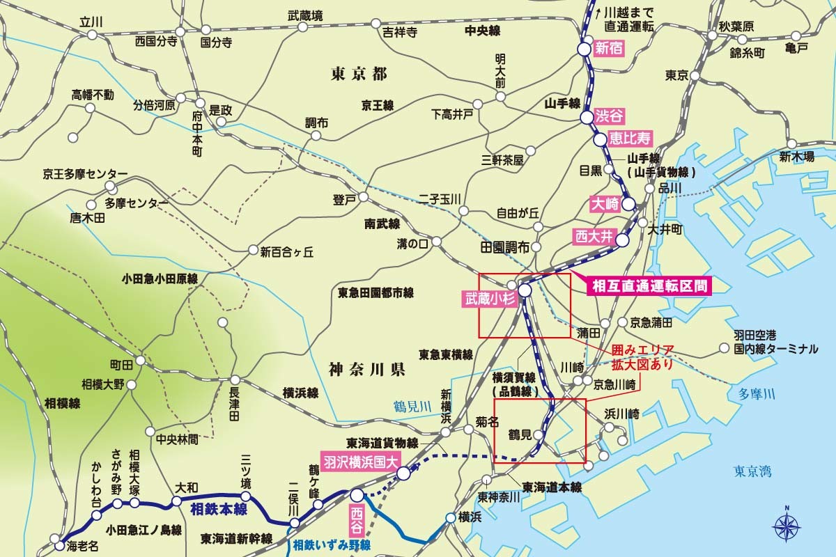 今回、誕生する新線の長さは2.7km。西谷駅(にしやえき)から新駅の羽沢横浜国大駅(はざわよこはまこくだいえき)間の距離は2.1km。羽沢横浜国大駅の先で東海道本線の支線・東海道貨物線と連絡する。JR東日本の路線から相鉄内へ乗り入れる列車は相鉄本線の終点、海老名駅まで走る。一方、相鉄からJR東日本の乗り入れる列車の多くは新宿駅止まりだが、一部の電車は先の、赤羽駅、大宮駅、川越駅などの駅まで直通運転が行われる。