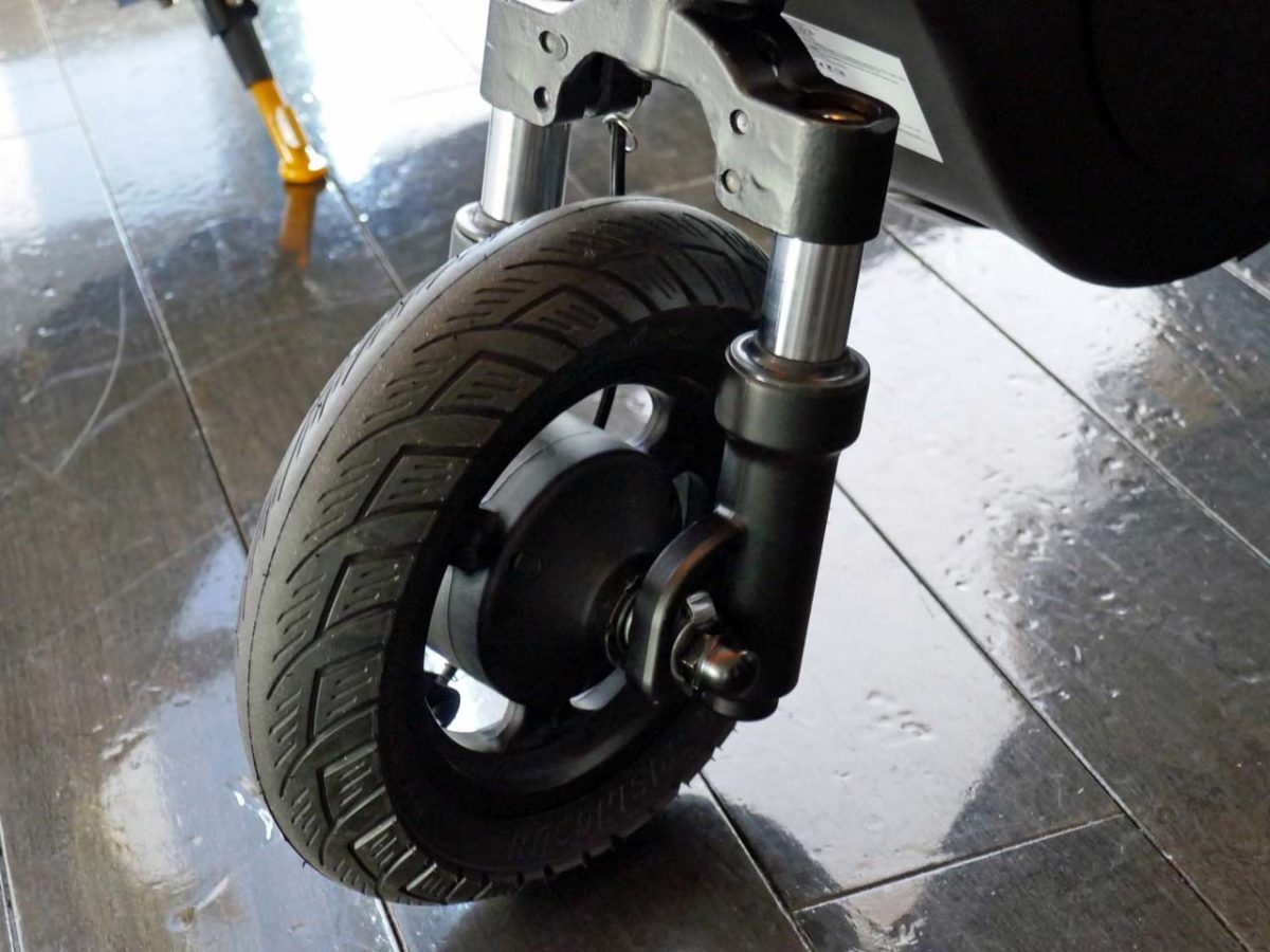 発表会後は室内での簡単な試乗会が開催されました。乗り方は最初に地面を蹴って4km/hまで速度を上げ、その後右手でアクセルレバーを下げてモーターで駆動させるという流れになります。操作はごく簡単です。ただ、4km/h以下まで速度が落ちるとモーター駆動はOFFされるため、用意された狭い会場では旋回に慣れないとすぐに壁に突き当たってしまいました。モーターがONされる4km/hという区切りを設けている理由として、停止時に不用意にアクセルレバーを操作しても発進しないようにするためだとのことでした。