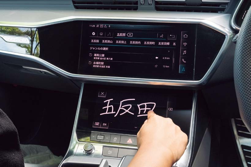 センターコンソールには2つの大型ディスプレイが設置されていて、エアコンからなにからすべてがタッチパネル操作式になっています。目的地検索の際には、下のパネルに指先で書いた文字を読み込み、検索候補を挙げてくれます。