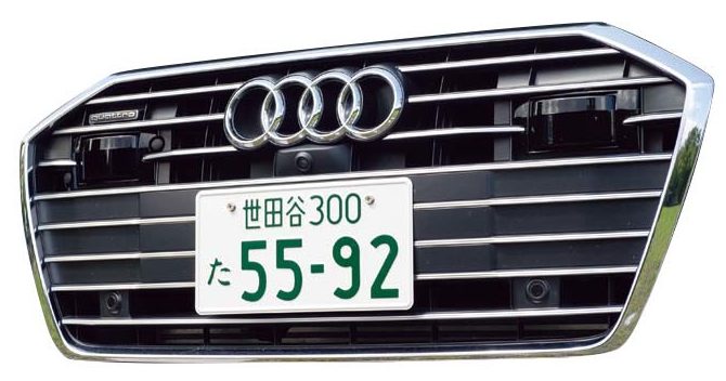低くワイドに設置された大型グリルは、「シングルフレームグリル」と呼ばれるもの。フチのメッキパーツが太くなり、セクシーさが増しました。よく見ると、レーダーやカメラなどの電子機器がたくさん設置されています。