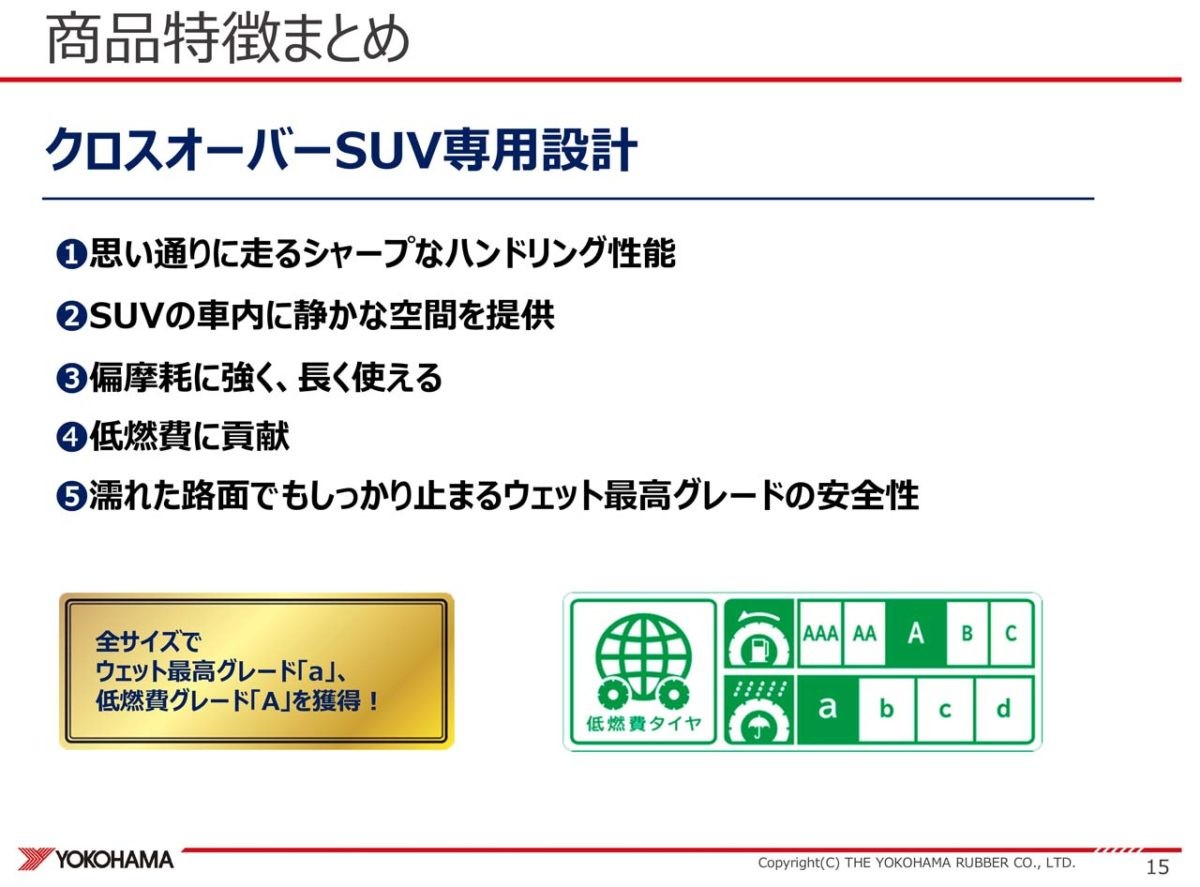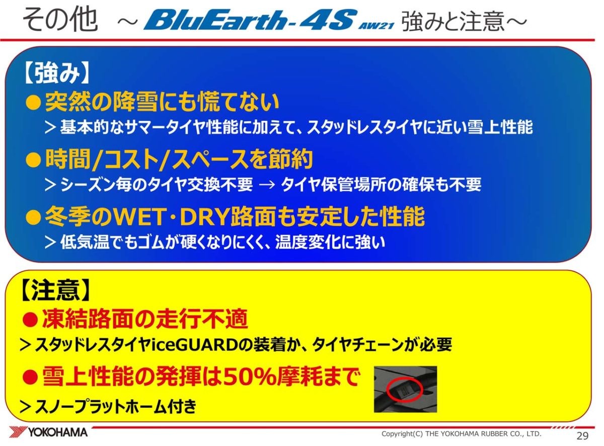 そして、今回の発表で最も注目すべきと思われたタイヤが、乗用車用オールシーズンタイヤBluEarth-4S AW21です。その名前の通り、サマータイヤとしての能力を備えながら突然の降雪にも対応できるということで、一年中履きっぱなしで使えるというのが最大のポイントです。最近は非降雪地域でも突然のドカ雪で慌ててしまうことも少なくありません。また、シーズンごとにタイヤを履き替える手間も大変ですし、履き替えたタイヤの保管場所に困ります。オールシーズンタイヤならそんな心配は一切なくなるのです。