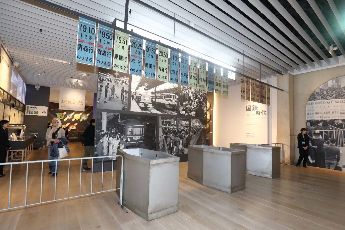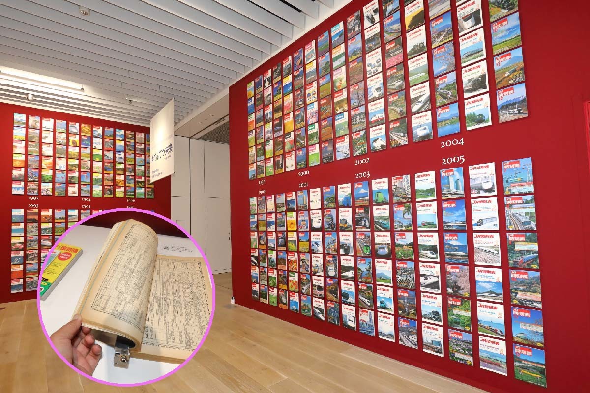 鉄道ファンの中には時刻表を見るのが大好きという人も多い。そんな人におすすめなのが、「時刻表インスタレーション&鉄道現代史映像ギャラリー」。1964年、JTBがまだ交通公社と呼ばれていた時代から、JRとJTB2社が出版している現代まで、時刻表の表紙がずらりと並ぶ。
