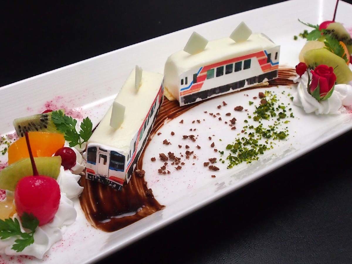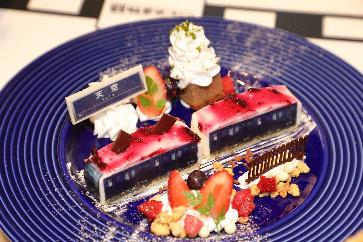 天鉄展にはレストランやカフェも用意され、ひと休みに最適だ。中でも「天空駅カフェ」(館内の「Café THE SUN」が特別仕様に)のメニューがおもしろい。鉄道にちなんだメニューが勢揃いしている。とくにオリジナル・デザートはスイーツ好きにお勧めだ。写真で紹介しよう。