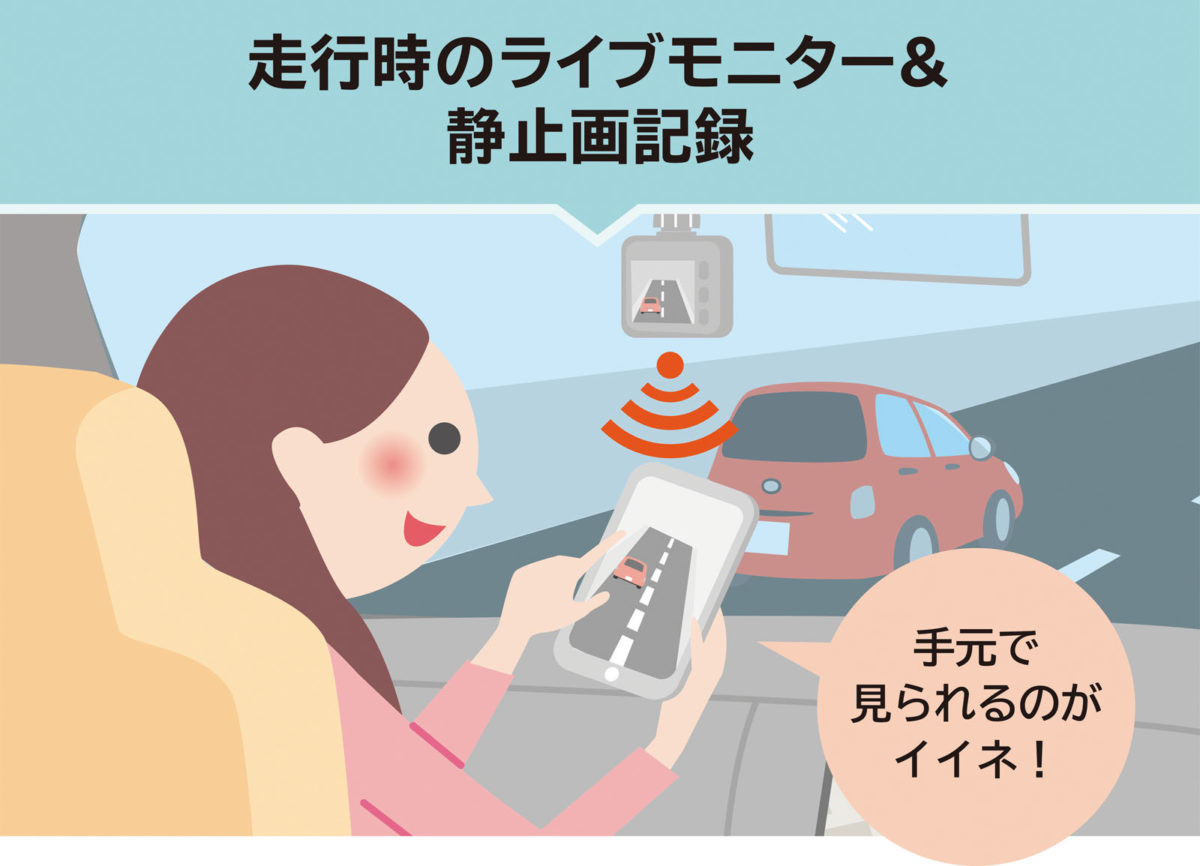 Wi-Fi対応のドラレコ。事故時の記録だけでなく、ドライブ中に記録した風景映像をスマホへ転送しSNSなどでシェアもできます。ドラレコでは珍しい3カラーが用意され、好みに応じて選択可能。