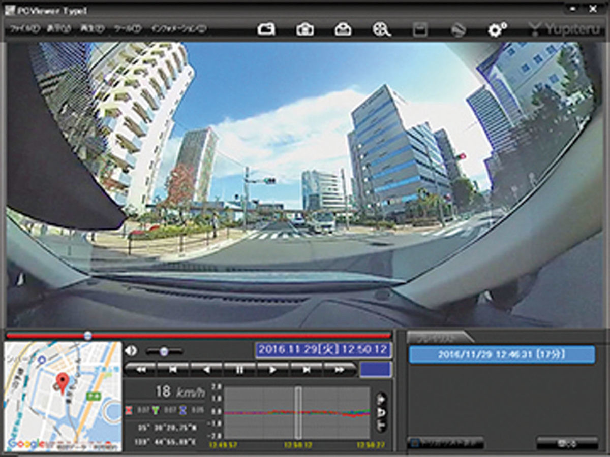 記録した映像の再生は専用のビューアソフトで行います。映像の反転(上下、左右、前後)と拡大・縮小も可能です。走行位置や速度、加速度も表示することができます。