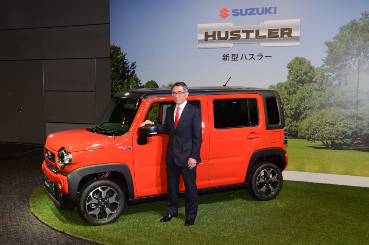 登壇したスズキの代表取締役社長・鈴木俊宏氏は、「先代は月販5000台目標でしたが、新型は+1000台の6000台!必達目標で考えています」と話しました。