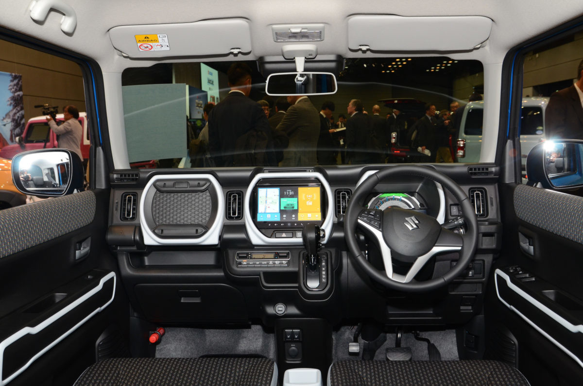 大きく変わったのは室内です。インパネのデザインではメーター/カーナビ・オーディオ/グローブボックスにそれぞれベゼルを設けたデザインになっています。インフォテイメント面では、スズキ初となる大きく見やすい9インチモニターを採用。進化した全方位モニターや、スマートフォンと連携したメモリーナビゲーションとなっています。