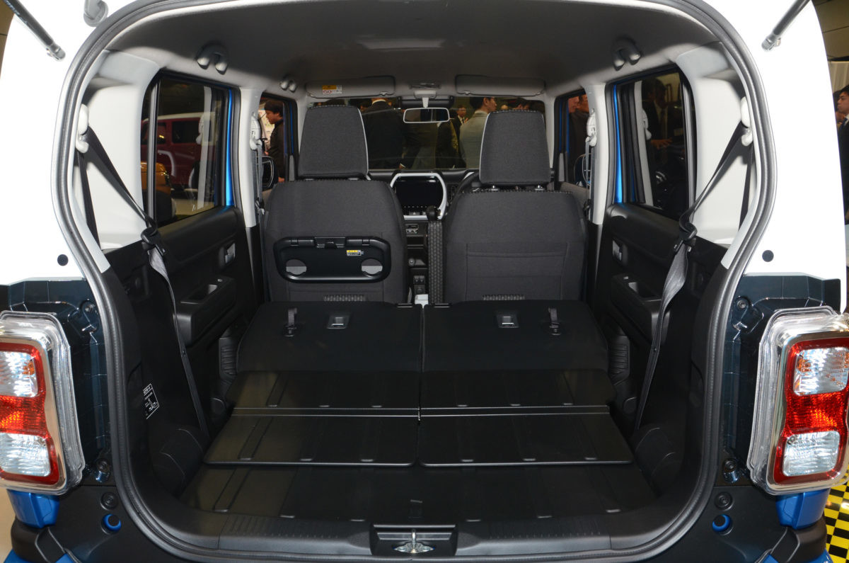 新型ハスラーのボディサイズは、全長3395mm×全幅1475mm×全高1680mm、ホイールベースは2460mmとなります。対する現行型ハスラーは全長3395mm×全幅1475mm×全高1665mmなので、大きさはほとんど変わっていませんが、現行型のホイールベースは2425mmと、35mm長くなっています。サイドスタイルでは、フェンダーアーチを黒で統一する手法は現行ハスラーを踏襲していますが、Cピラーに新たに窓を設けたことで、現行とは大きくイメージが異なりました。