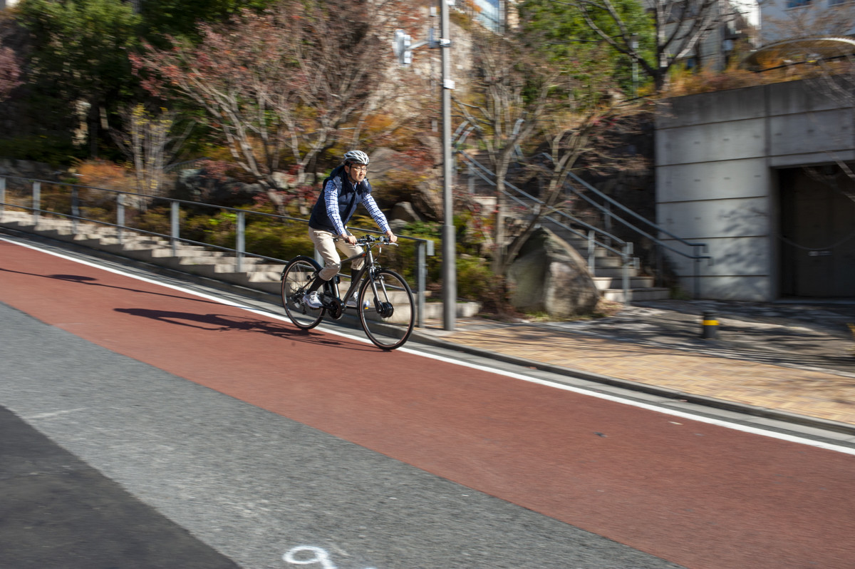 尾島:誤解のないように言うと、TB1eは電動アシスト法令基準の24km/hまできっちりアシストしてくれるので、ぜんぜん遅くないんです。ただロードバイク乗りの習性として、どうしても自転車に乗るとガシガシとペダルを回したくなるんですよ。電動アシスト以上のスピードを無意識に求めていた(笑)。そういう乗り方じゃなく、電動アシスト“なり”にペダルを回していくとこの自転車はすごく気持ちがいい。TB1eの開発者の方が「シティサイクルとクロスバイクの中間くらいを目指して作った(詳細はコチラの記事を参照!)」と言っていたのですが、それがすごく分かりますね。頑張って走るんじゃなくて楽に走る。楽に走ってもパワーがあるから軽快なんですよね。