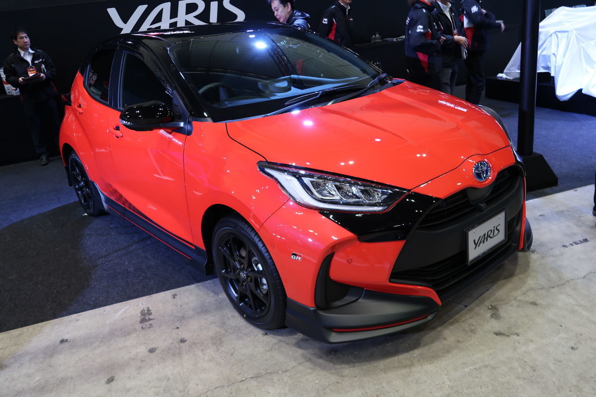 まずは、トヨタGRブースから「GR ヤリス」を紹介。新型ヤリスにGRパーツが組み込まれた赤いヤリスが展示されました。フロントスポイラー、サイドスカート、リヤサイドスポイラーとクォリティの高いGRパーツによってヤリスが精悍に生まれかわる様子が覗えます。