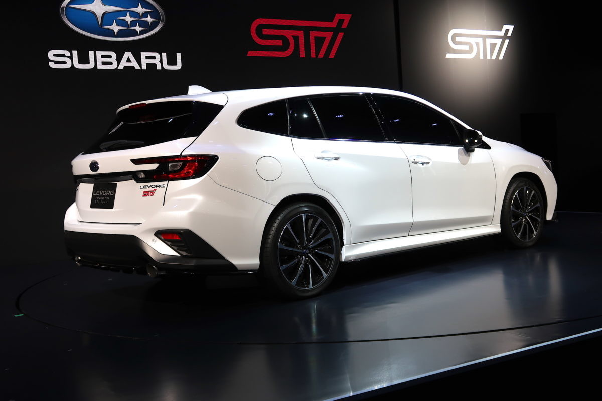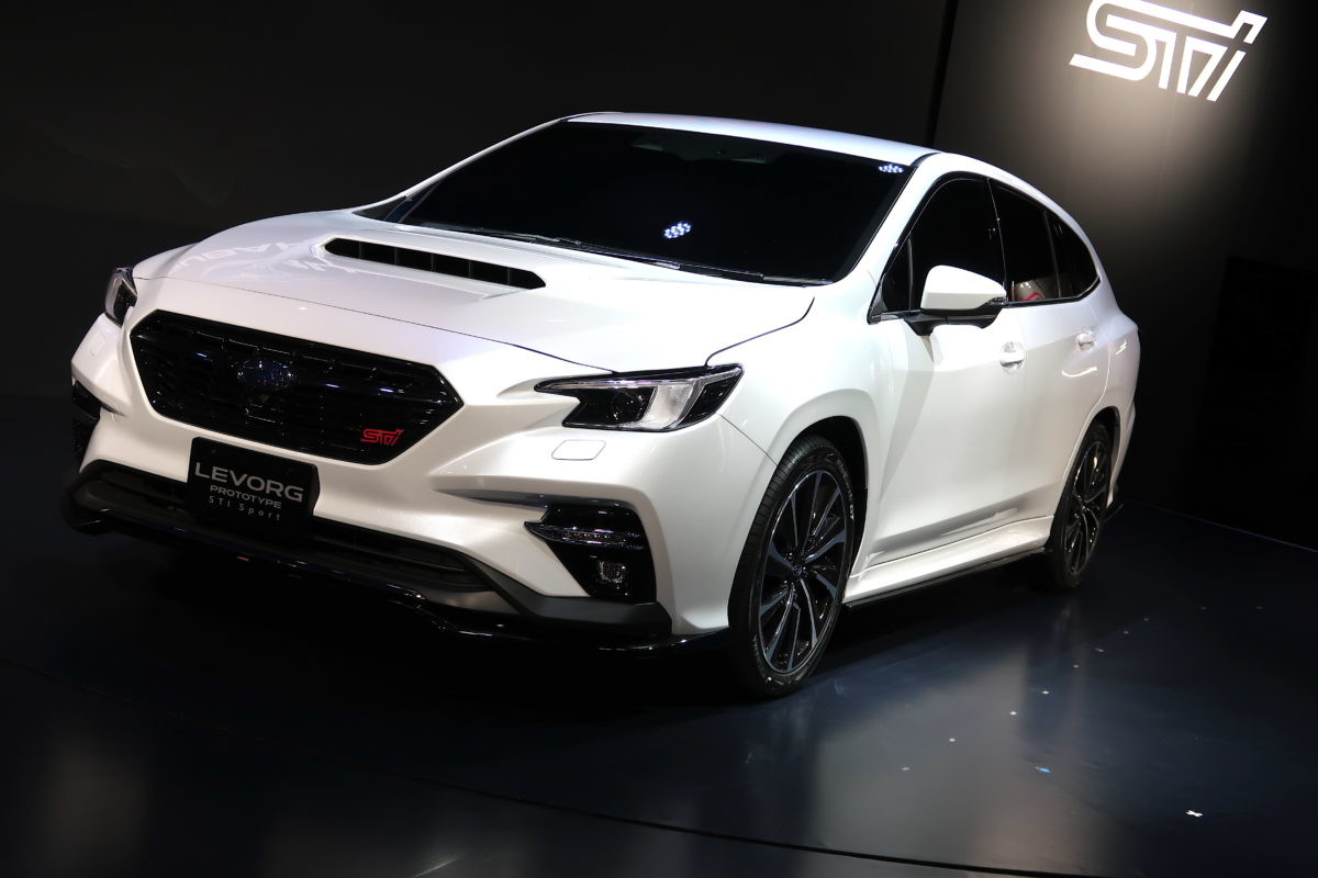 スバルブースのセンターには、昨秋発表された新型「レヴォーグプロトタイプ」の STI Sportバージョンでした。外観的にはボディ下部、フロントスポイラーからクルマ一回りをつなげた黒いリップと、各部のSTIエンブレムが特徴。