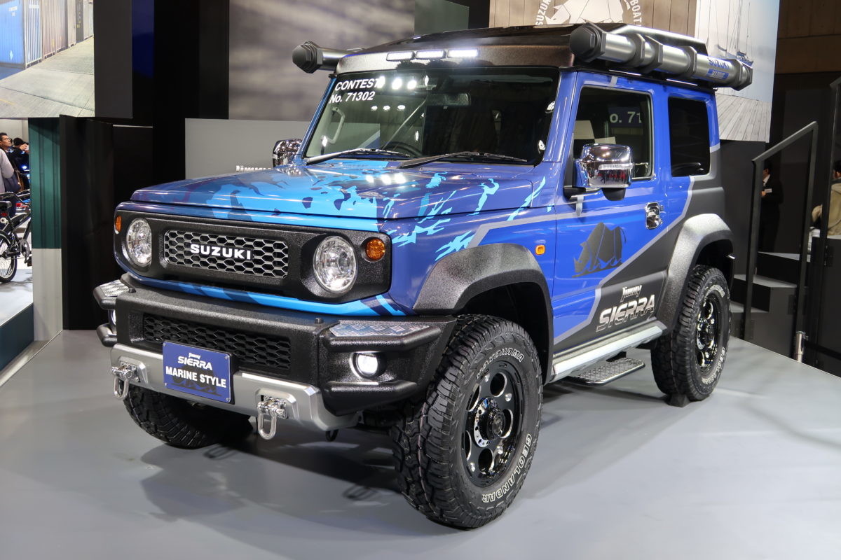 また、ニュー「ジムニーシエラ」をベースにマリンスタイルと名付けられた参考出品車もワイルドなイメージで目を引いています。シエラならではのワイドなオーバーフェンダーとマリンライフを楽しむための装備はジムニー/ジムニーシエラと皆さんのライフスタイルとの楽しみの世界をイメージさせてくれます。