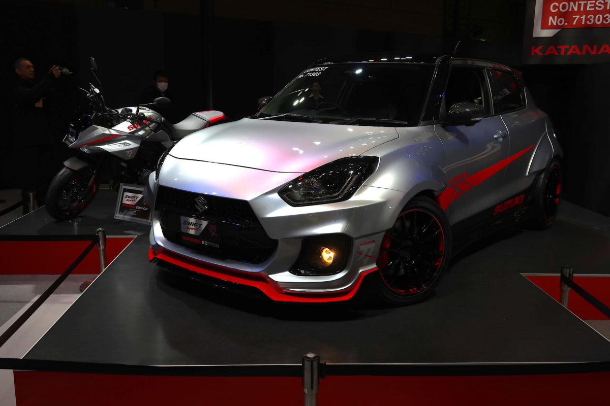 そして、ブースの奥にはスイフトスポーツの参考出品車の「カタナエディション」が展示されました。一時代を築いた名バイクのカタナが刷新されて話題となっていますが、そのカタナと雰囲気を合わせ、スイフトのエクステリアを研ぎ澄まし、名刀の雰囲気を醸した提案です。現在は参考出品ですが、大きく張り出したフェンダーやスポーツムードはオートサロンにピッタリなイメージとなっています。