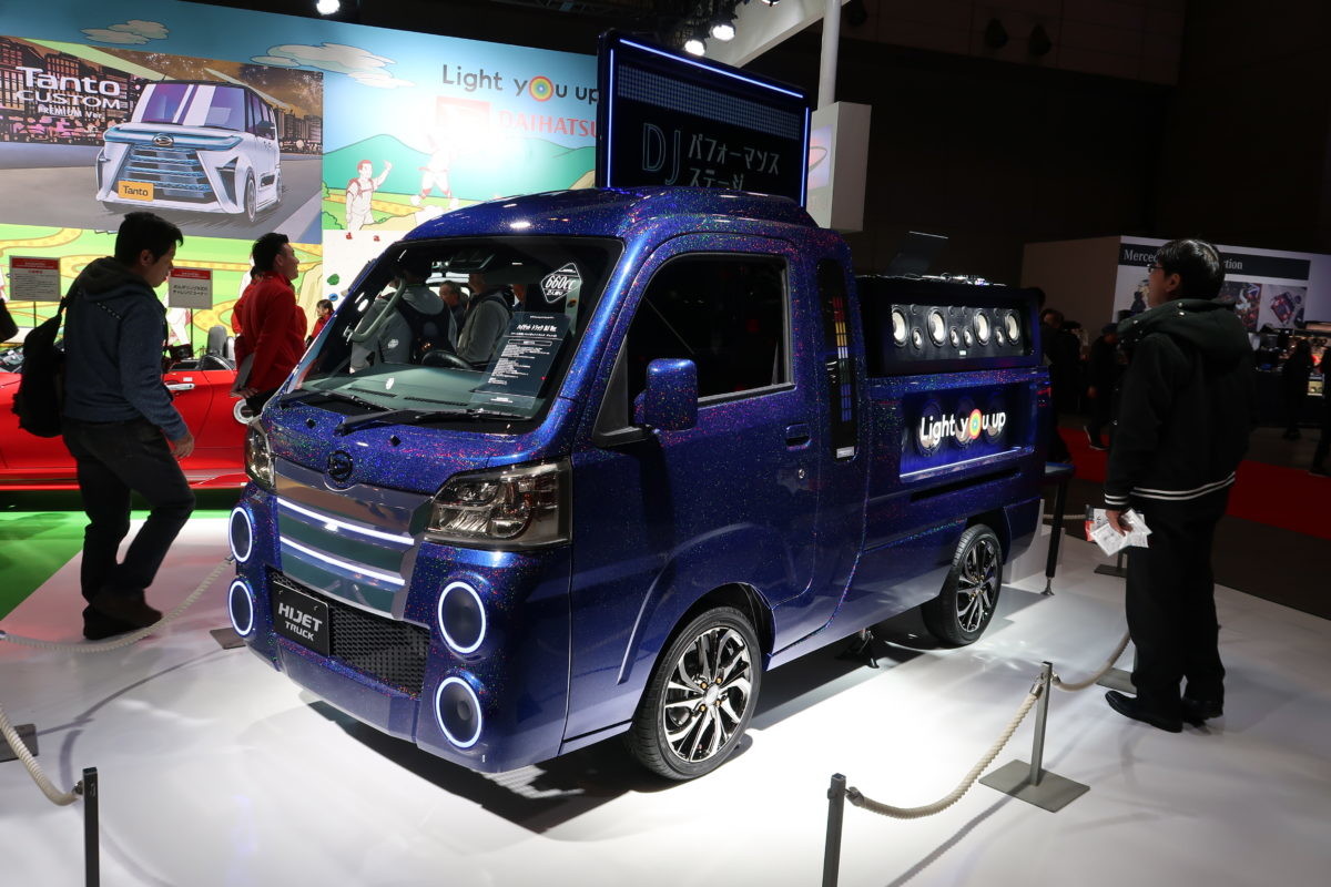 スズキブースではハスラーの参考出品車「ストリート ベース」。同車はコンテナをイメージしたマットカラーを外装に採用。内装はスピーカーとイルミネーションによりライブ会場のような音楽と光の世界を表現しています。その他に鮮やかで楽しい雰囲気の2トーンカラーのハスラー、そしてオプション満載のハスラーも華やかに展示されていました。