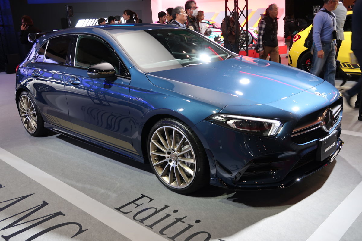 前編の最後はメルセデス・ベンツブースから2台のAクラスAMGを紹介します。まずブルーの「A35 4MATIC Edition1」。環境性能を意識しながらもAMGらしいパワフルコンパクトエンジン搭載でツインスクロールターボが組み合わされ、意のままの力強い加速感と環境性能の高いバランスをとっています。大人な雰囲気が漂います。